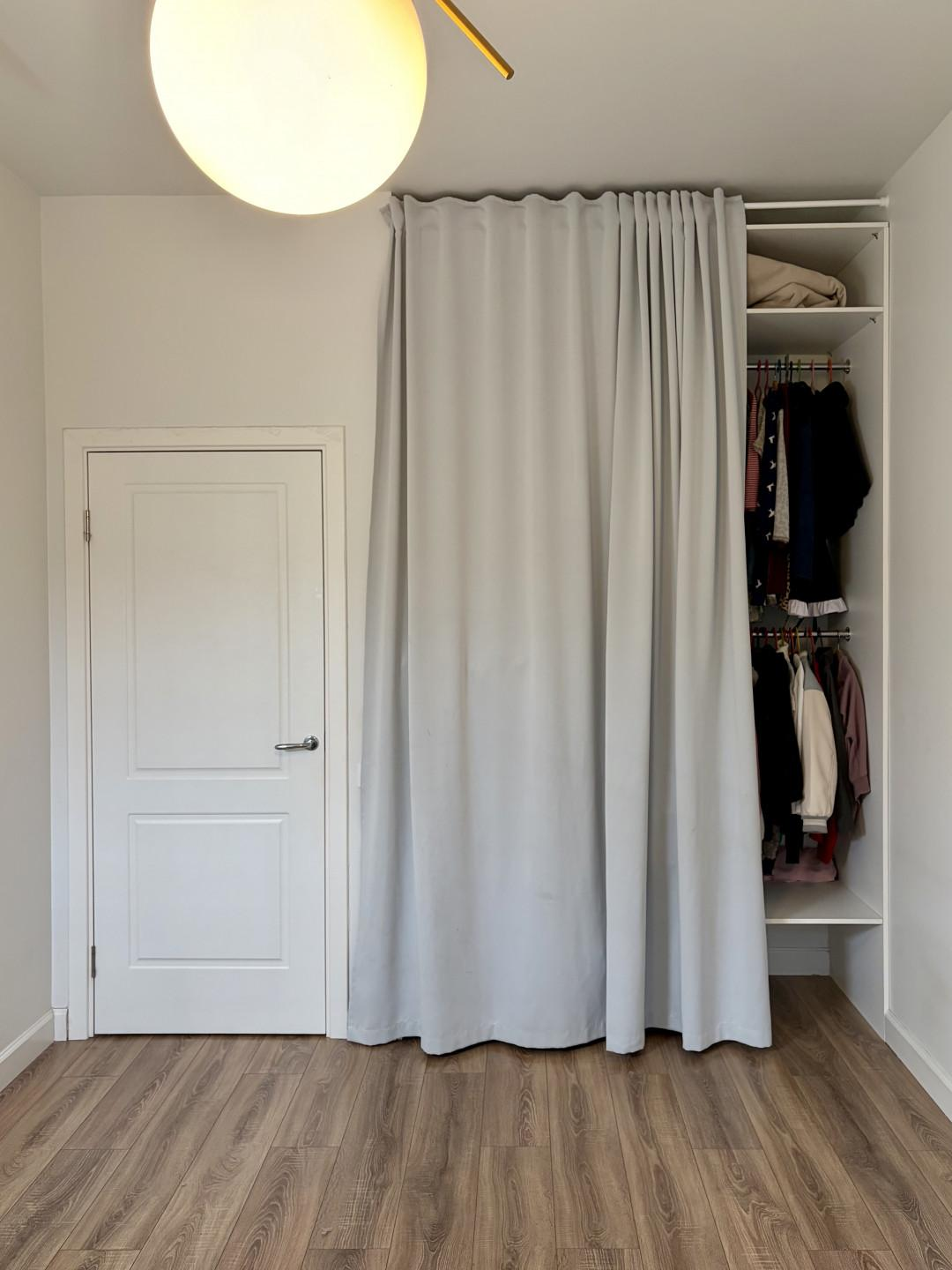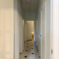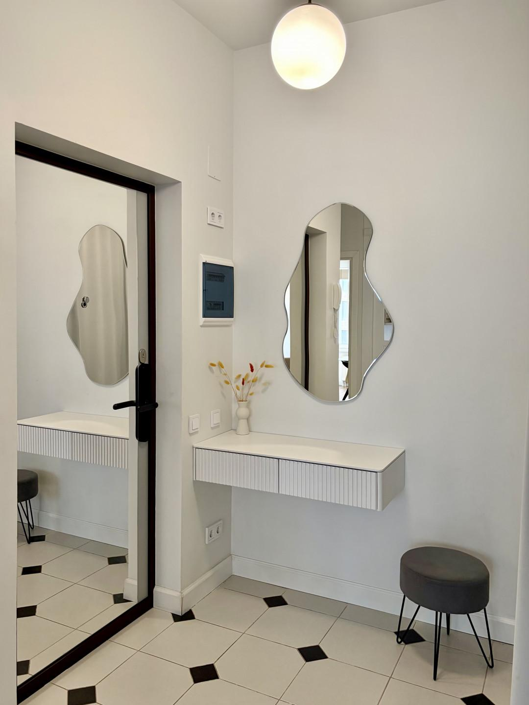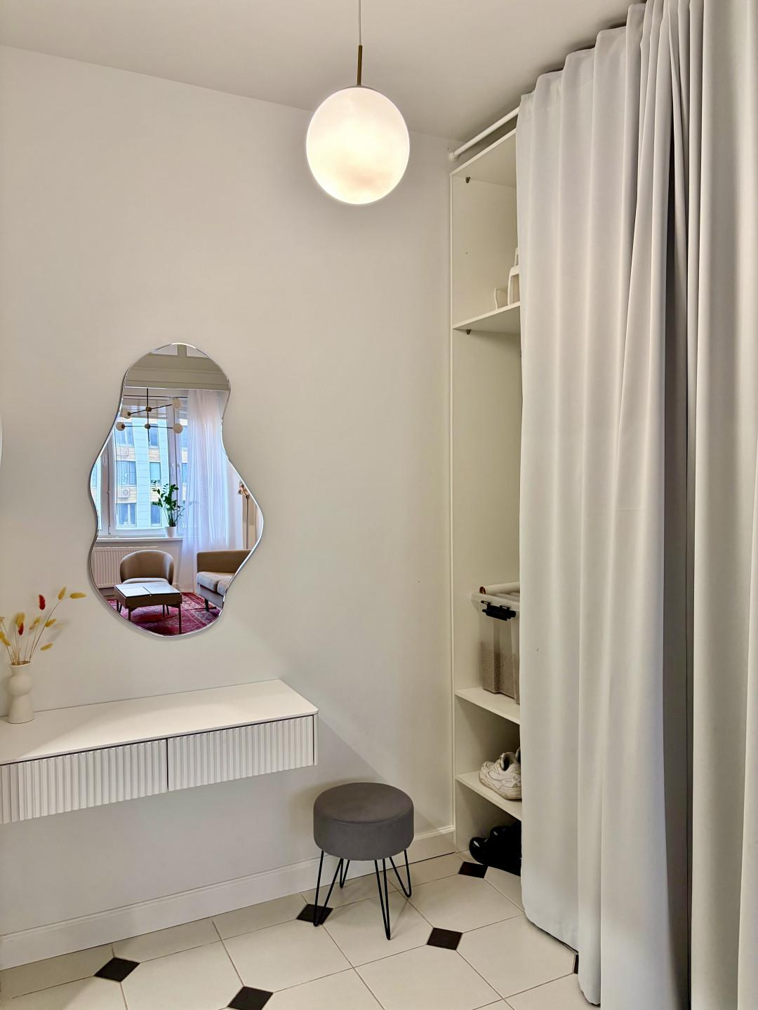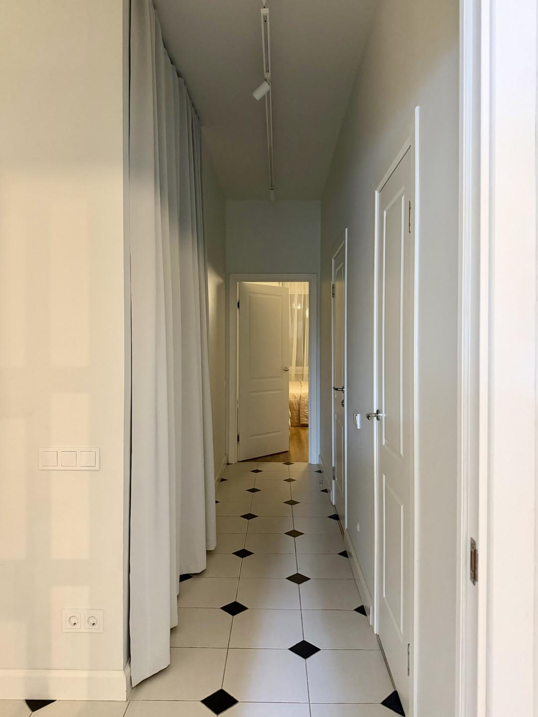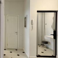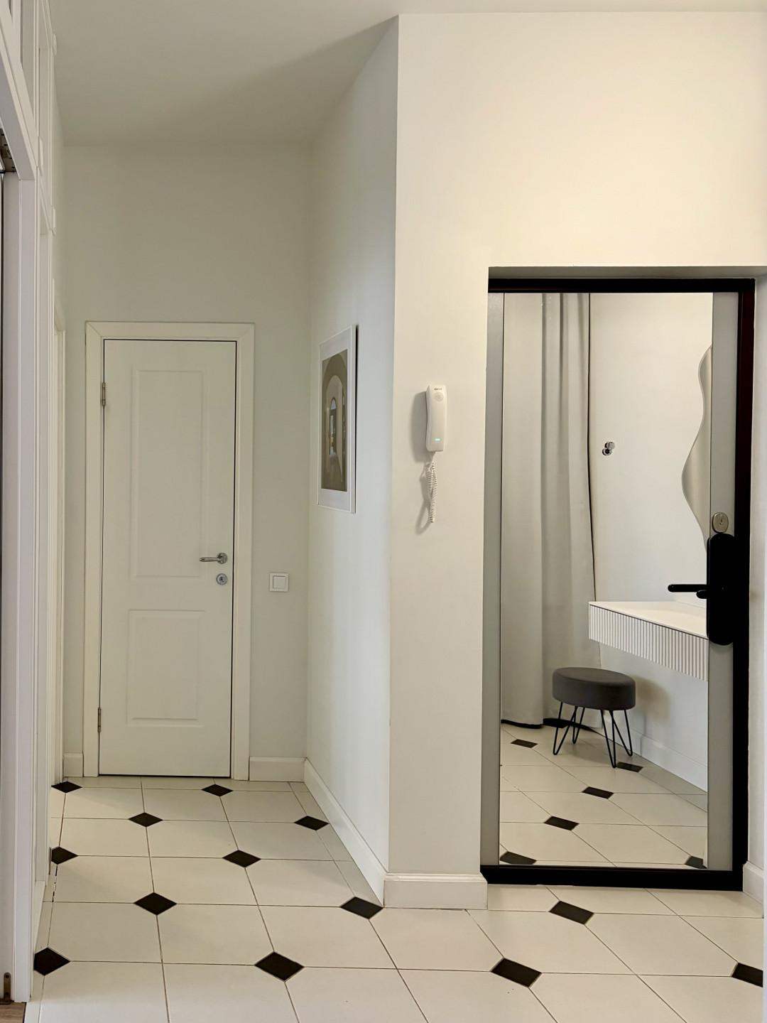 Просторная прихожая с нишей под гардероб до потолка. На входной двери зеркало во весь рост - удобно делать селфи. Роутер спрятан в шкафу.