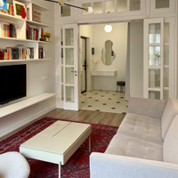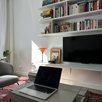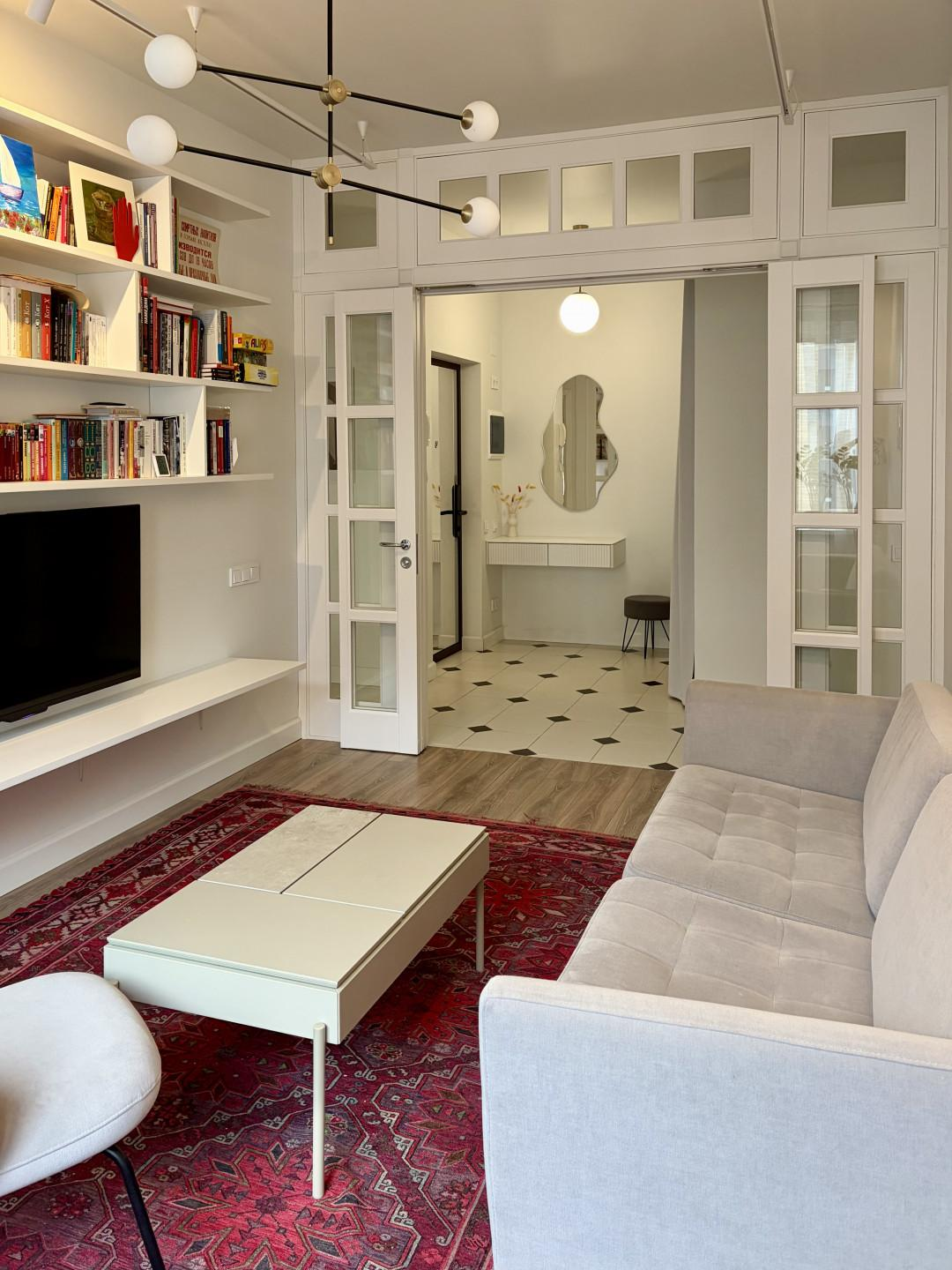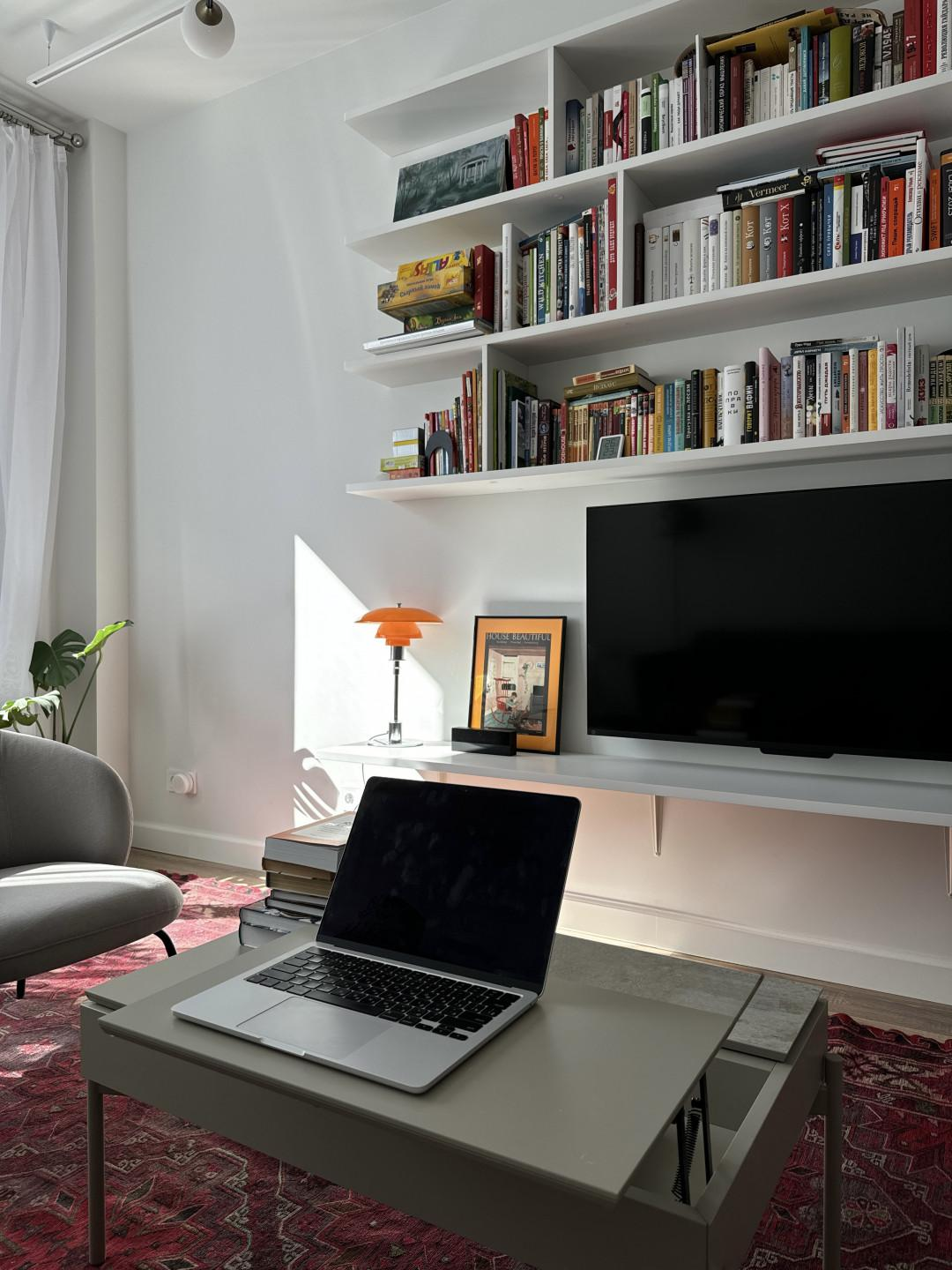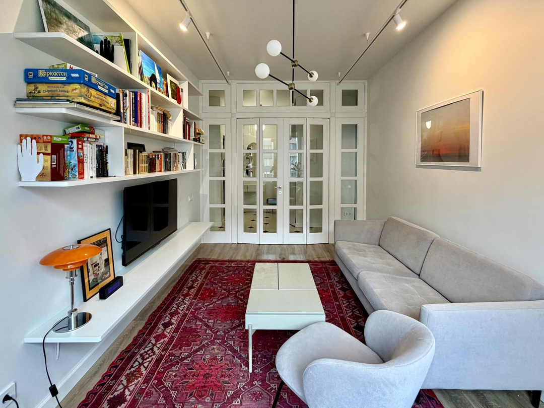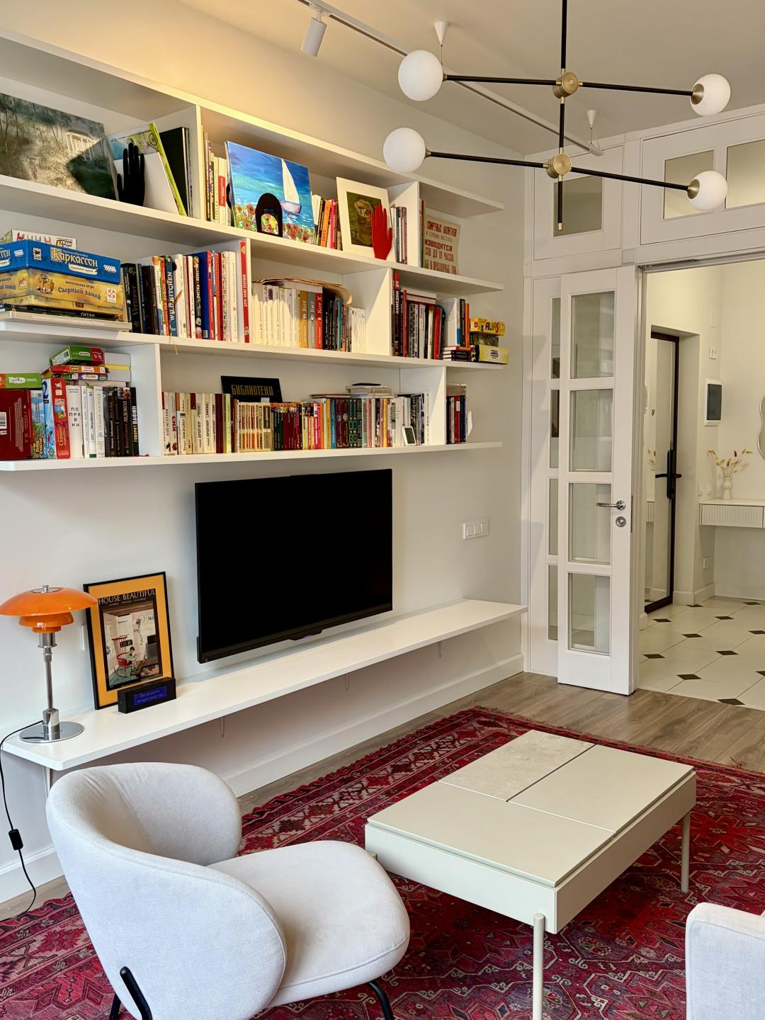 Большая гостиная с высокими стеклянными дверями. Воздушный стеллаж для книг и ТВ.