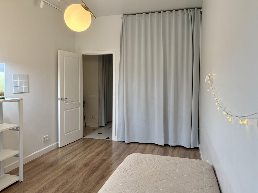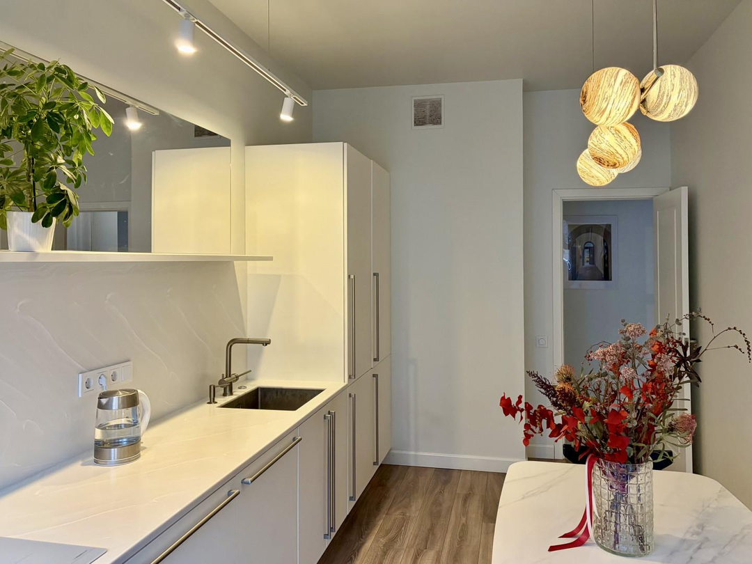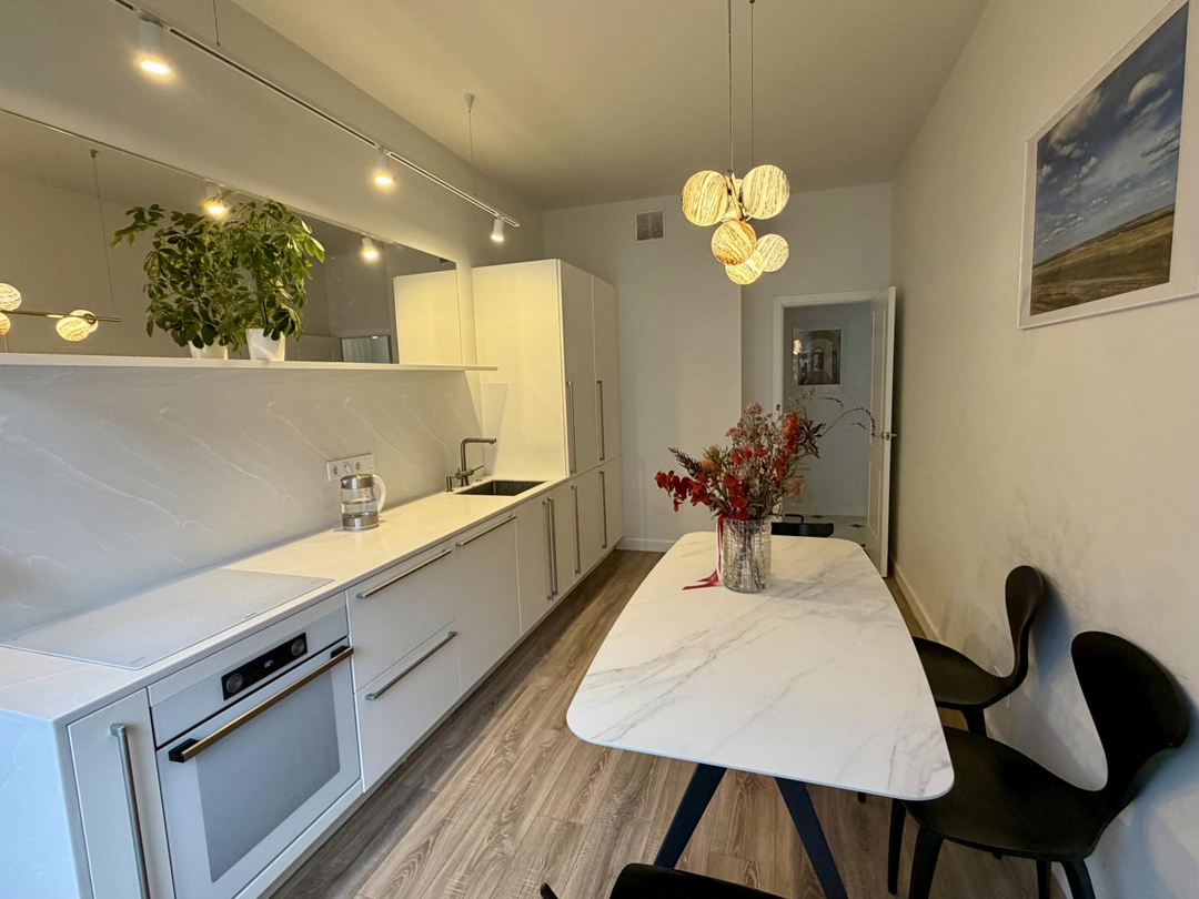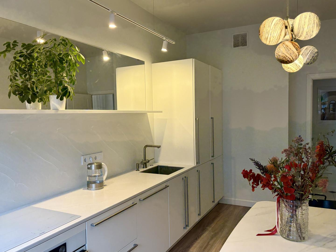 Светлая 3-комнатная квартира в новом доме с большой кухней, постирочной и двумя санузлами.