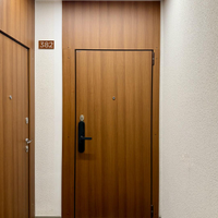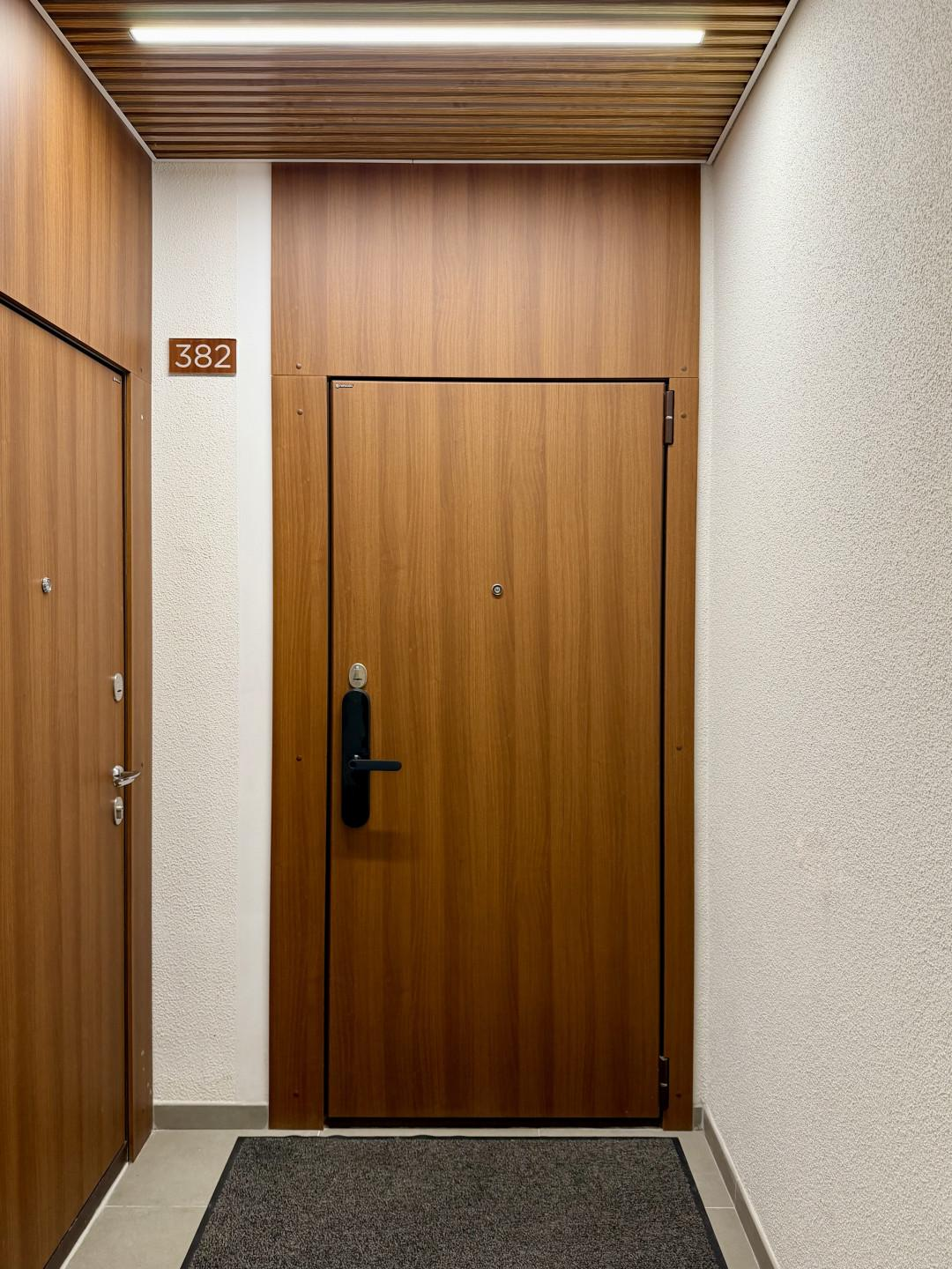 На входной двери умный замок. Вход по отпечатку пальца, коду или магнитному ключу.