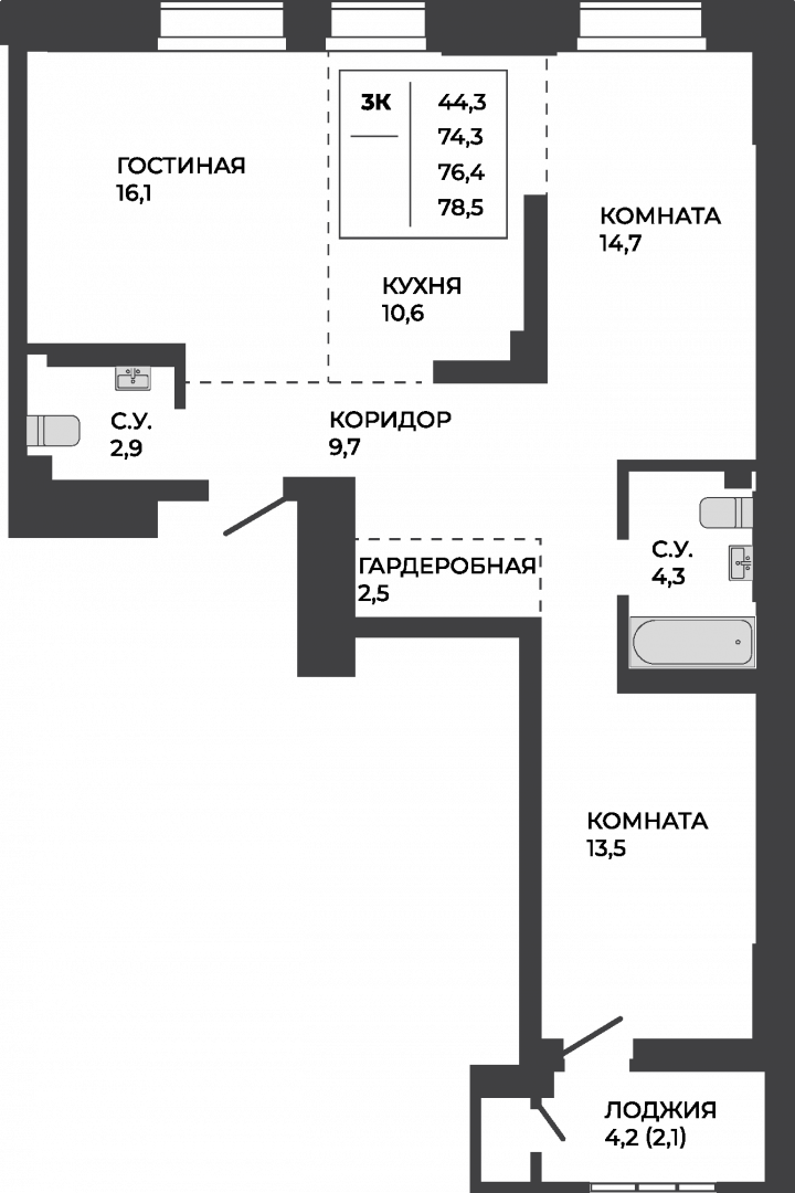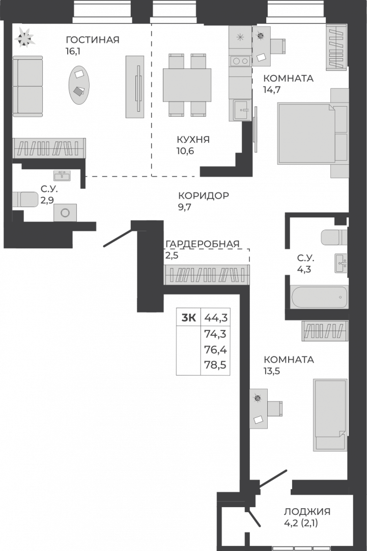 Особое предложение: Уникальная 3-комнатная квартира на 16 этаже. Окна выходят на две стороны, в квартире два санузла и шикарная лоджия с панорамным остеклением. Сдача — Июнь 2028 г.