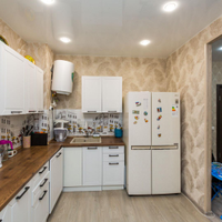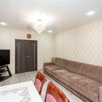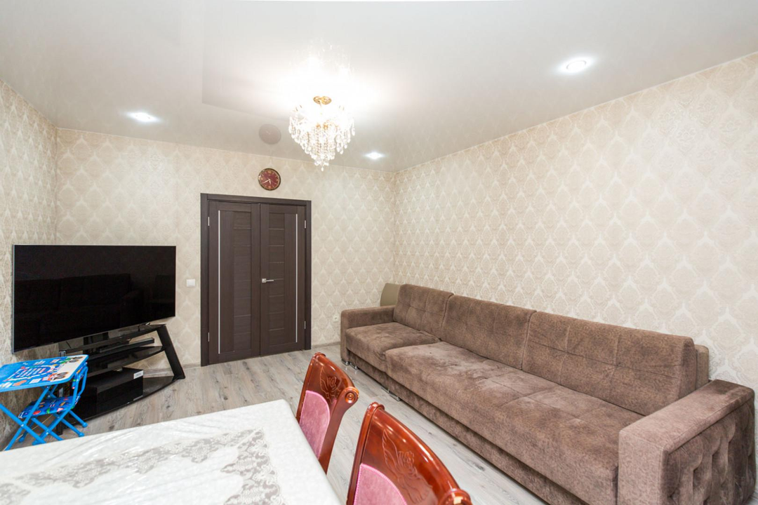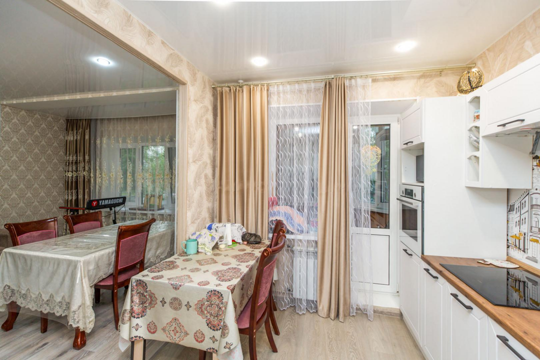 В квартире выполнен ремонт с перепланировкой в современный формат 2+ с кухней-гостиной: зал объединен с кухней.