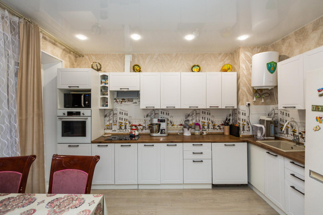 Кухня с выходом на балкон. Установлен кухонный гарнитур со встроенной техникой. Бойлер, используется в летнее время при отключении горячей воды.