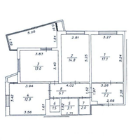 Площадь 77,7 кв.м., три изолированные комнаты (13 / 14,8 / 17,1 кв.м.), кухня 12,9 кв.м., большая остекленная лоджия из спальни 10 кв.м. раздельный сан.узел, в прихожей большой встроенный шкаф.