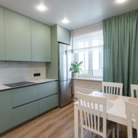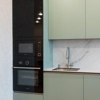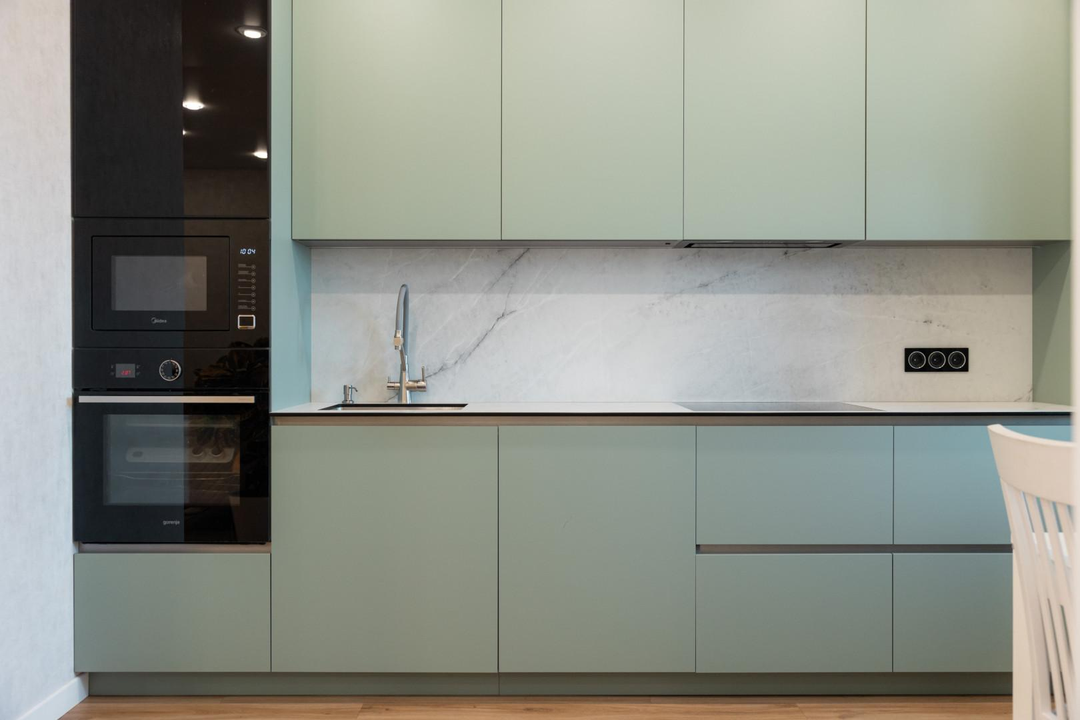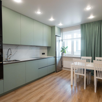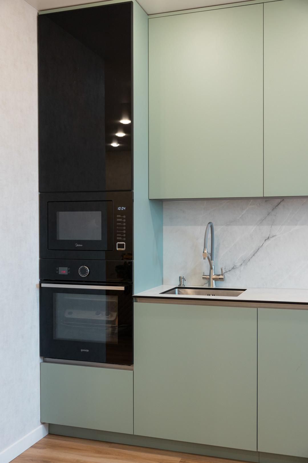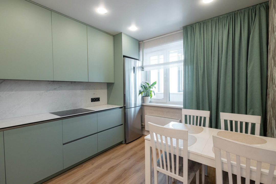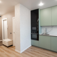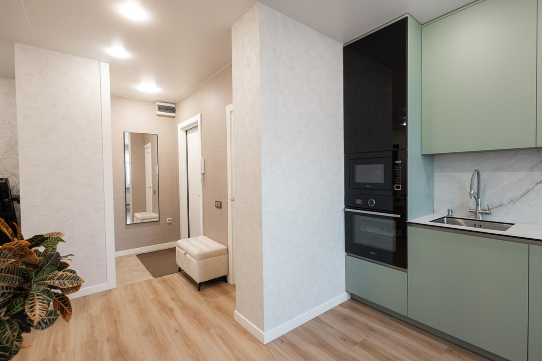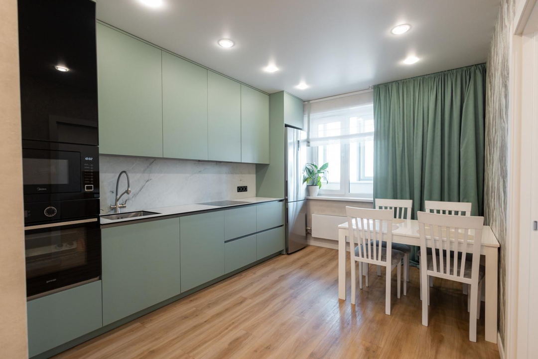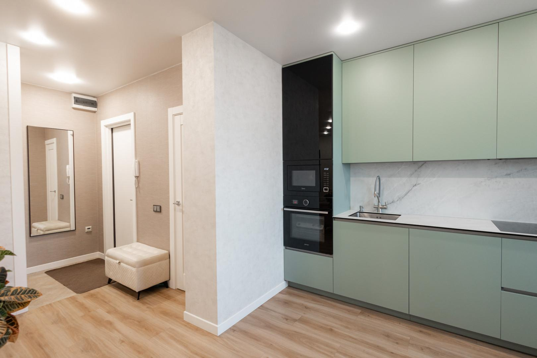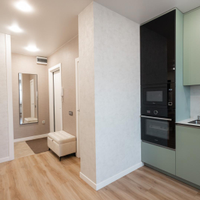 - На кухне остается встроенная техника и гарнитур, что является приятным бонусом.