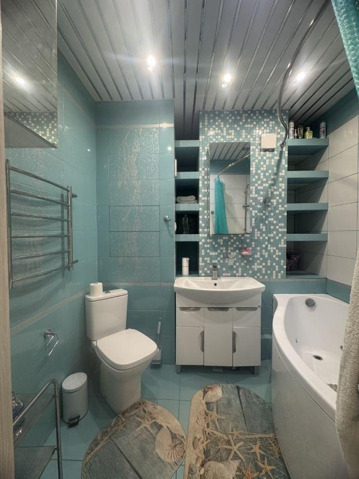 Ванная комната отделана польской плиткой, установлена ванна объемом 400 литров с подсветкой.