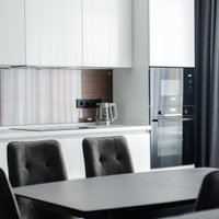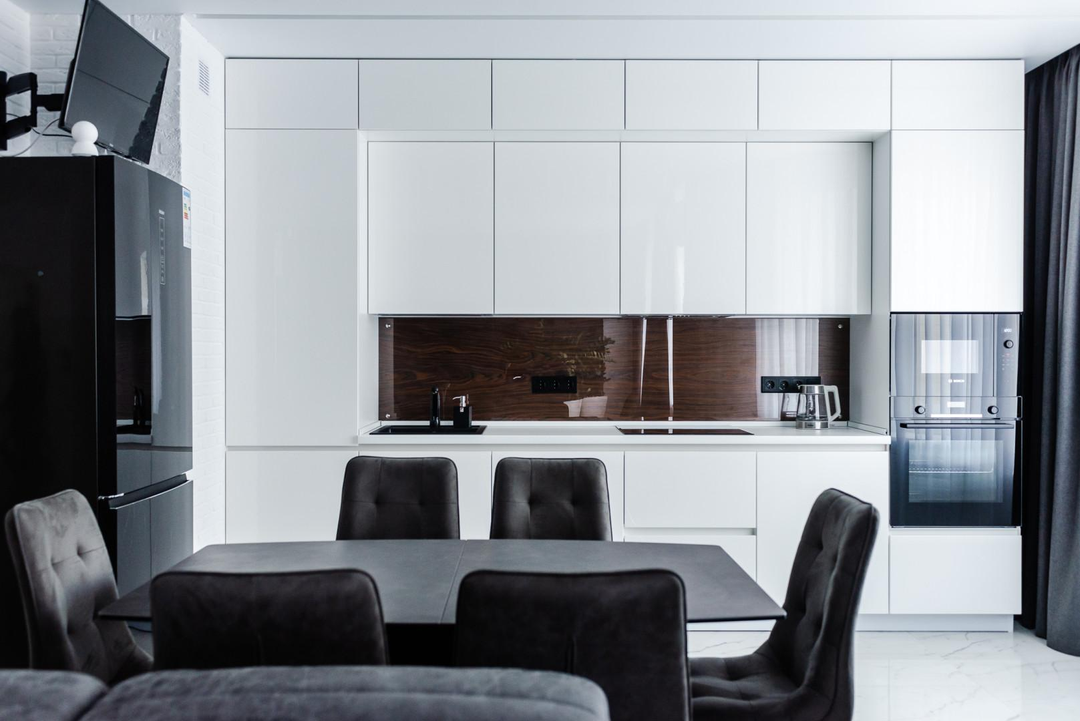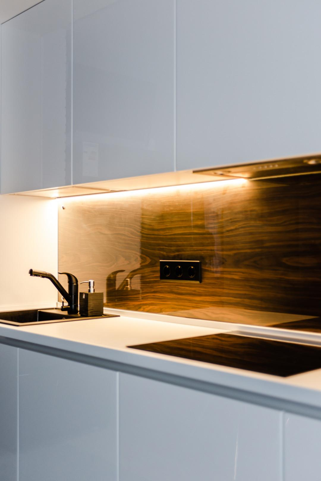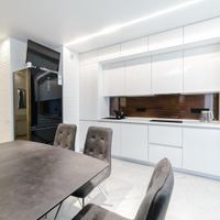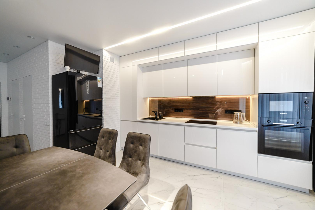 Отдельно порадует хозяйку обеденная зона : кухня выполнена по эскизу кухни Мария , на индивидуальном производстве с фасадами мдф окрашенными по рал в глянце с фартуком из эксклюзивной стеновой панели в шпоне под стеклом осветленным Оптивайт( без зеленцы , с сохранением натуральности панели). Фурнитура на фасадах на ящиках выдвижных с доводчиками итальянских производителей.
