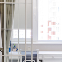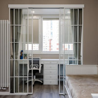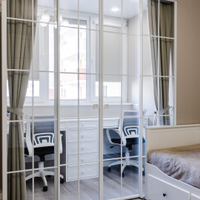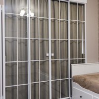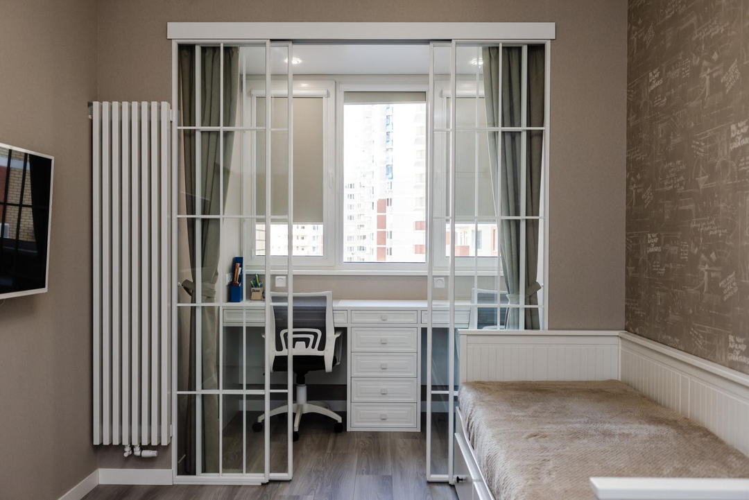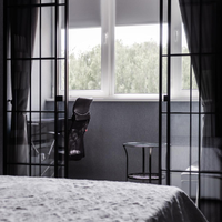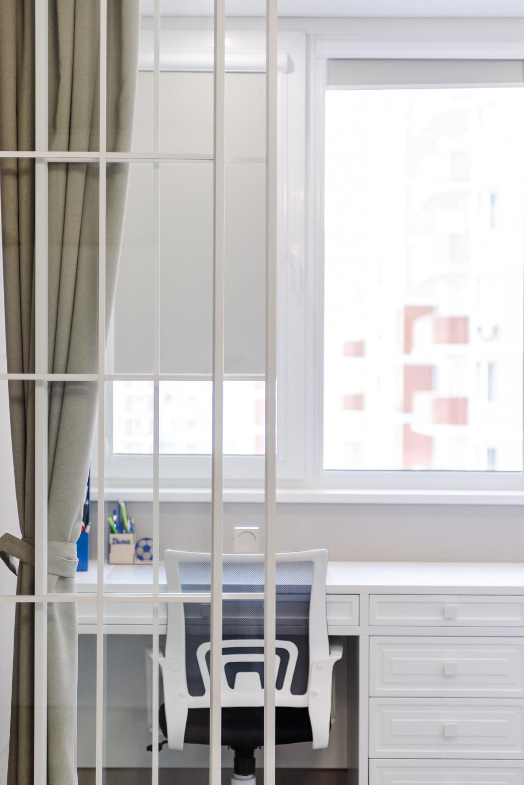 В интерьере использовались: в рабочей зоне спальне и детской раздвижные перегородки известного итальянского брэнда Artelle. Надежная система отопления в общей зоне, в детской и спальне индивидуальные окрашенные в цвет интерьера вертикальные батареи. Шторы в гостиной зоне , в зоне рабочей в детской и спальне высококачественные производства Турция . Отдельно предусмотрены в детской и спальне жалюзи механического управления подобранные в цвет обоев.