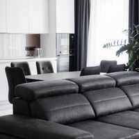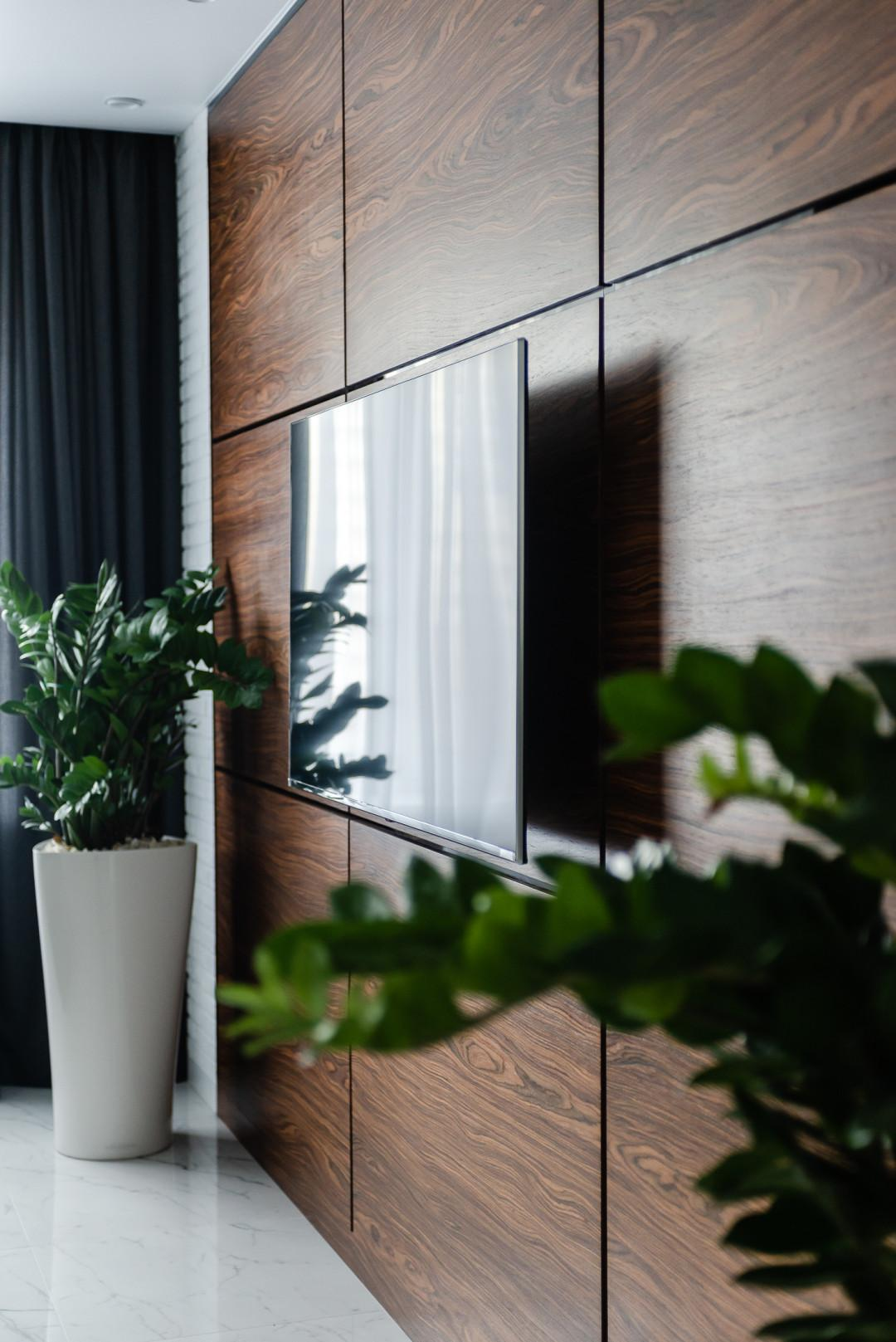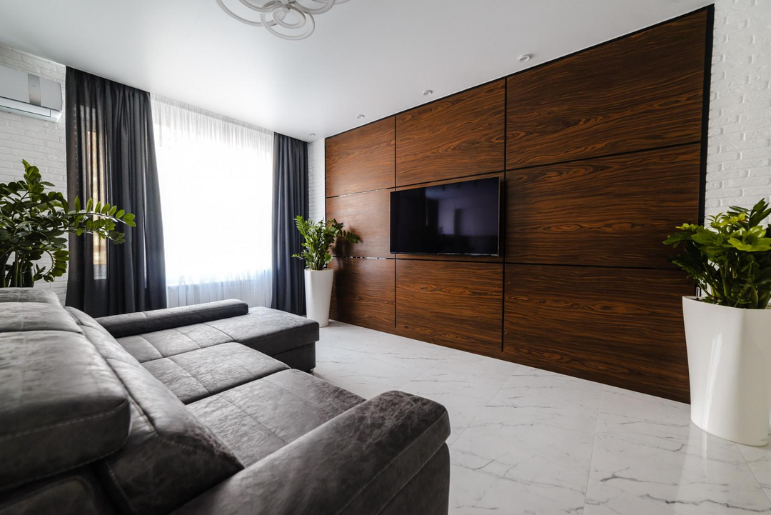 В интерьере гостиной использовался гипсовый камень С индивидуальной подгонкой в плоскости стен и эксклюзивными шпонированными панелями Bonitacasa.