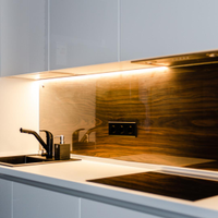 Много работы сделано по световой группе. Вся разводка на каждую группу проложена в гофре и отдельно, стоят стабилизаторы напряжения. Сделаны разные вариации подсветки в кухонной зоне , гостевой , спальне, детской. Дорогостоящие обои ( Англия)ANDREW MARTIN в детской и комнате.