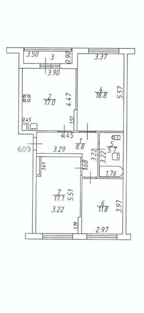 Жилая площадь 47,7 м², кухня 17 м². Потолки 2,9 м. Застеклённая лоджия 3 м² с панорамными окнами. Совмещённый санузел 5,7 м².