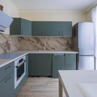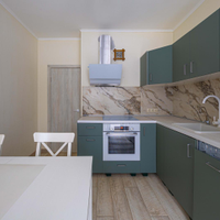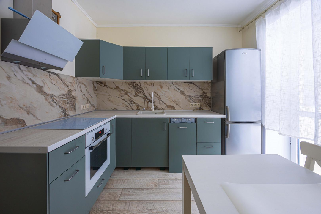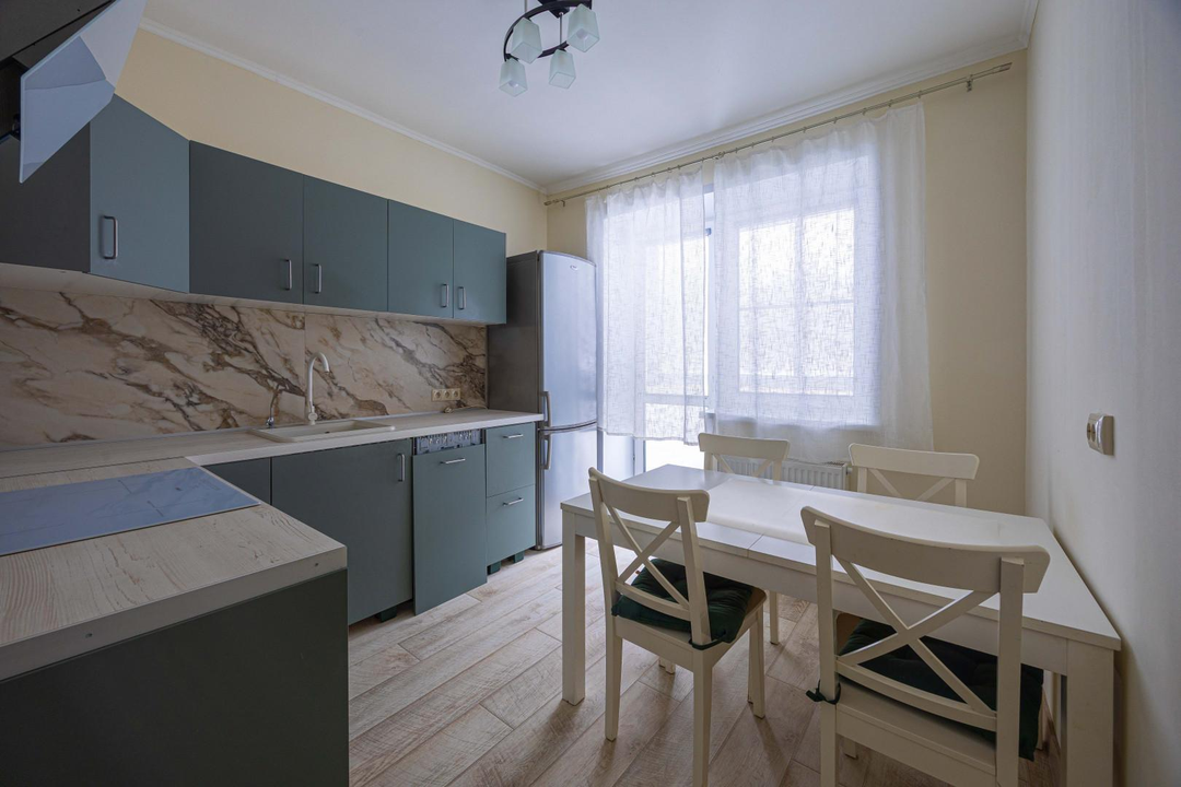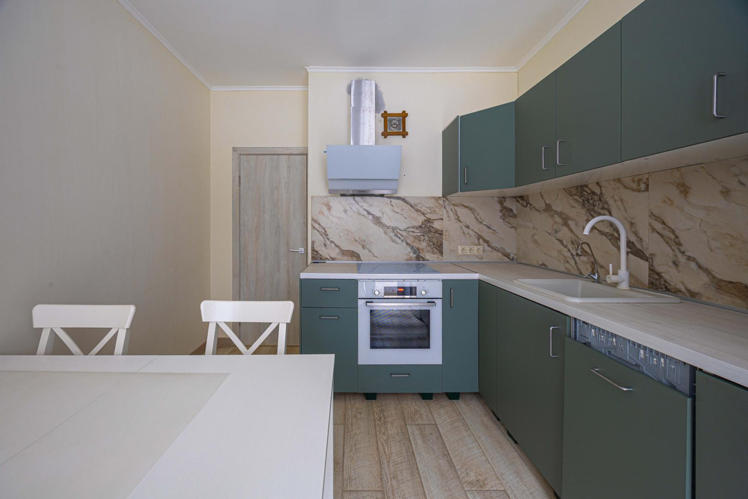 -Кухня Икея со столом и стульями со всей необходимой бытовой техникой остается все кроме холодильника: вытяжка и посудомойная машина и плита с духовкой, вытяжка.