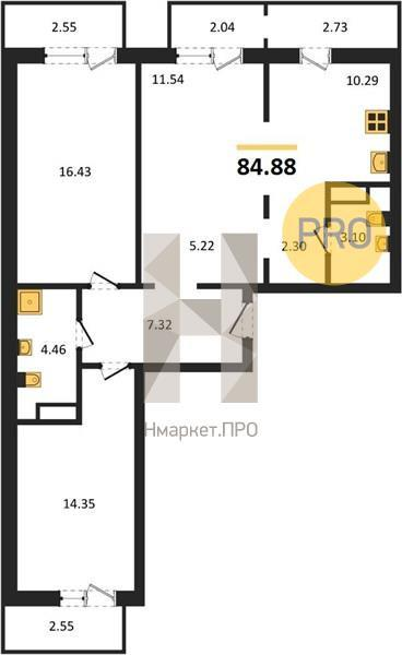 Общая площадь: 84,88 м²