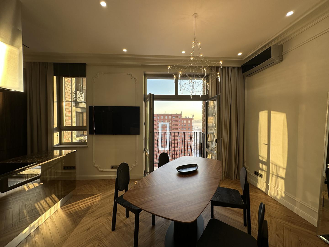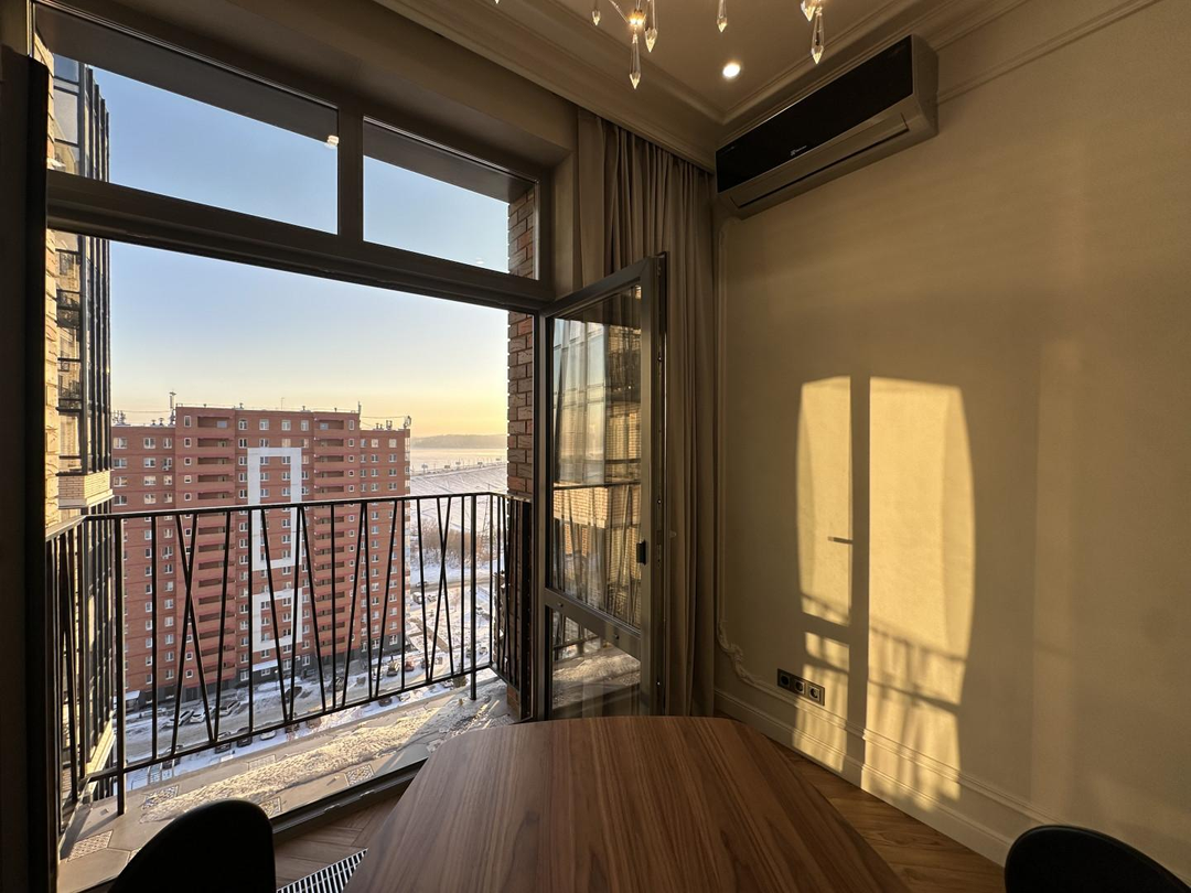 Ливингрум выполнен в светлых тонах, украшением которого является кухня и островок с поверхностью из кварцевого агломерата, а также встроенной техникой. Пол выложен штучным керамогранитом. Три контура для создания тепла: напольный конвектор, обогрев откосов и обогрев пола. У французского балкона с видом на Ангару расположена обеденная группа из массива. Комбинированная система освещения (трекинговое, споты, люстра) и электрический карниз, управляемые через телефон, позволяют создавать нужную атмосферу.