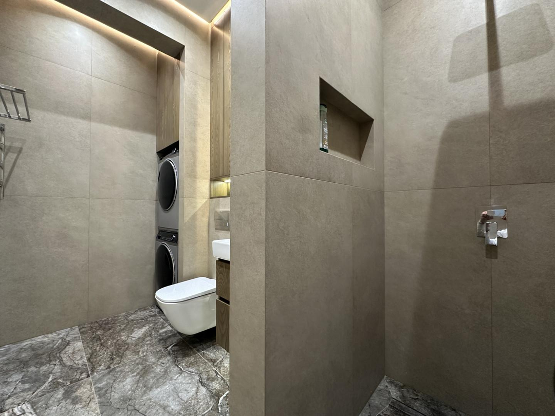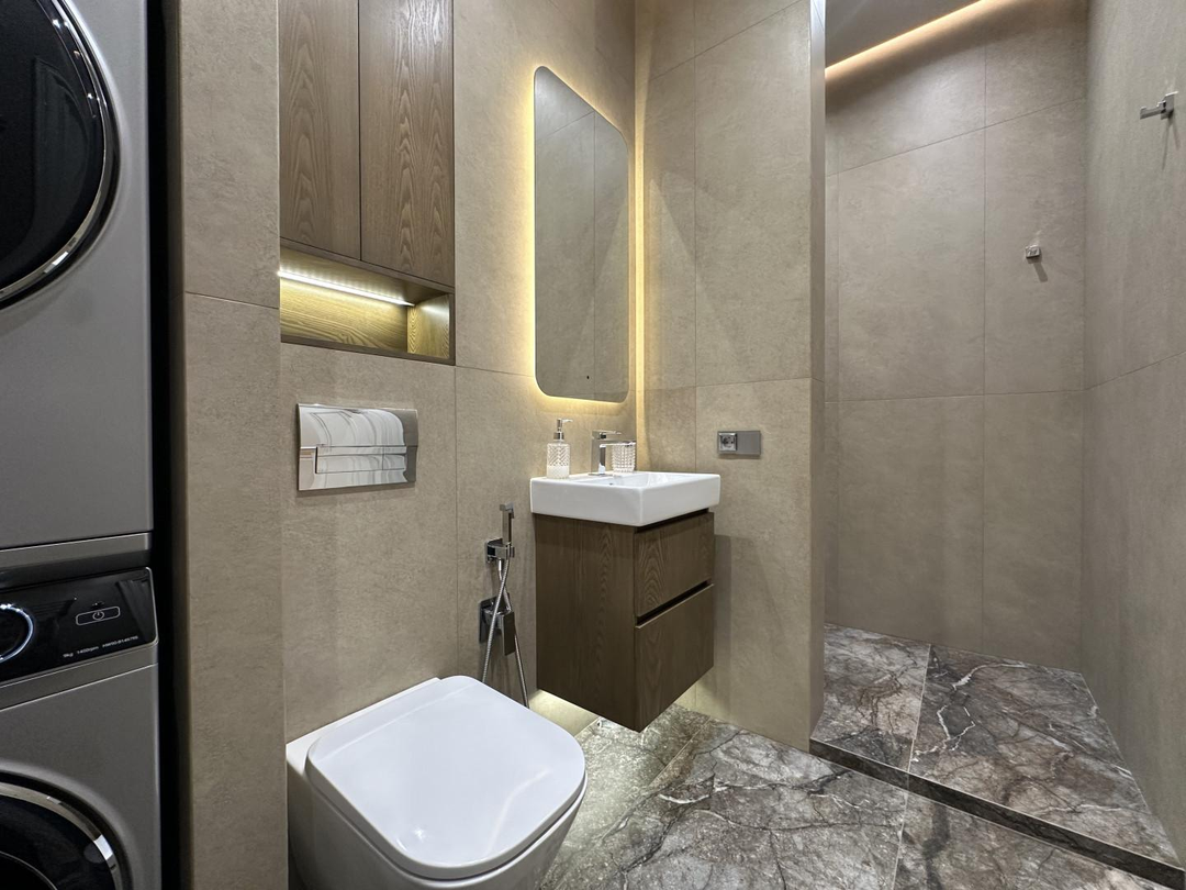 Душевая комната с выделенной зоной для стиральной и сушильной машины, инсталляцией, системой обогрева и водонагревателем, позволит решить основные бытовые задачи.
