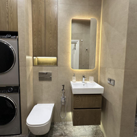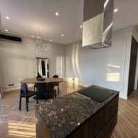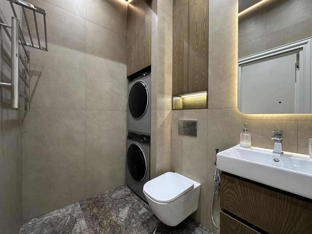 В квартире предусмотрена вся необходимая техника для комфортного проживания: встроенный холодильник, посудомоечная машина, духовой шкаф, варочная панель, вытяжка, кондиционер, стиральная машина, сушильная машина, водонагреватель, электрокарниз