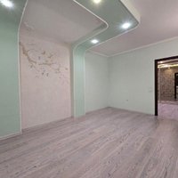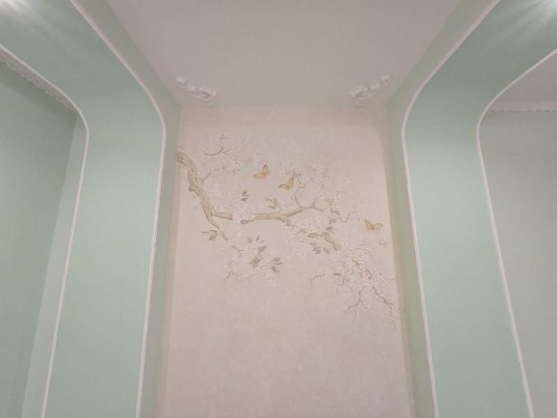 -разноуровневый потолок с точечным освещением, в спальне выровнен и покрашен: