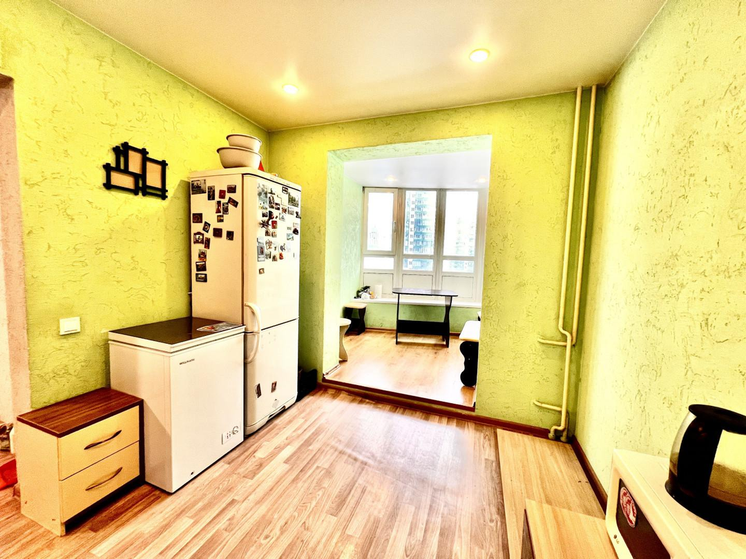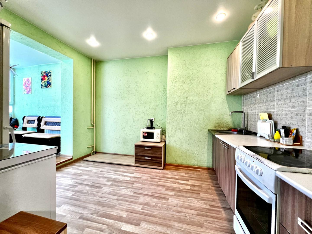 Продуманная кухня площадью 14 м² создана путем объединения оригинальной кухонной зоны (8,08м²) с утепленной лоджией (6,08 м²). Такое решение позволило организовать просторную и функциональную зону для приготовления и приема пищи, где можно разместить всю необходимую технику и мебель.