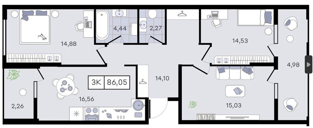 Застройщик предоставляет различные планировочные решения: от уютных студий от 23 кв м до больших евро 4 площадью 89.7 кв м.