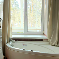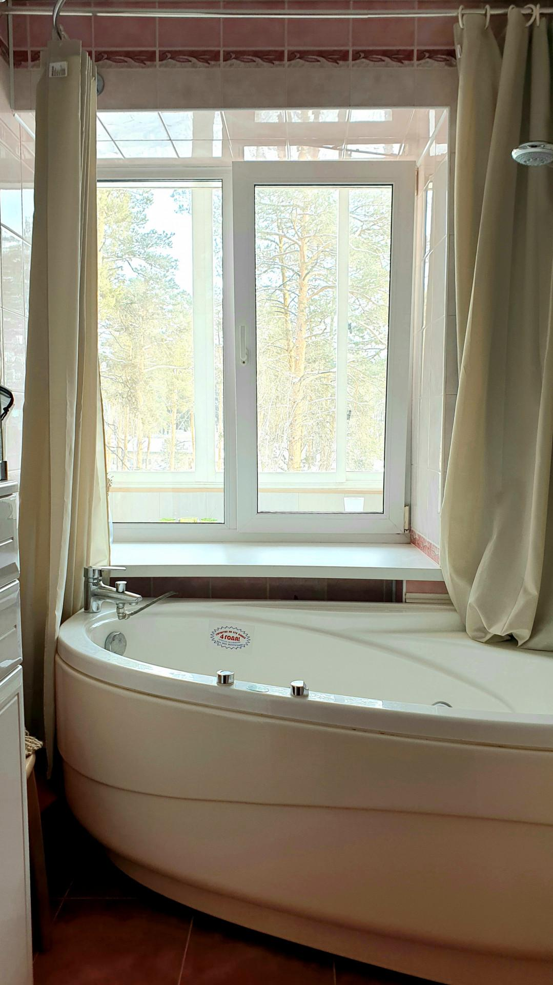 Отличительной особенностью является уникальная планировка: в ванной комнате сделано окно на балкон и установлена джакузи, позволяющая наслаждаться расслабляющими процедурами с видом на сосны.