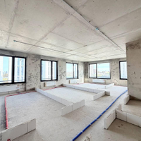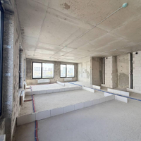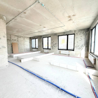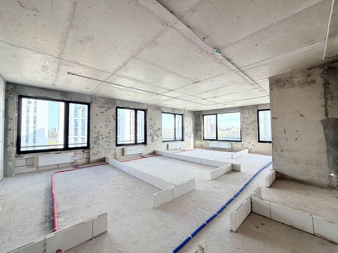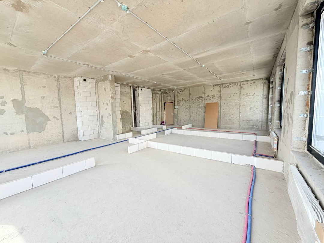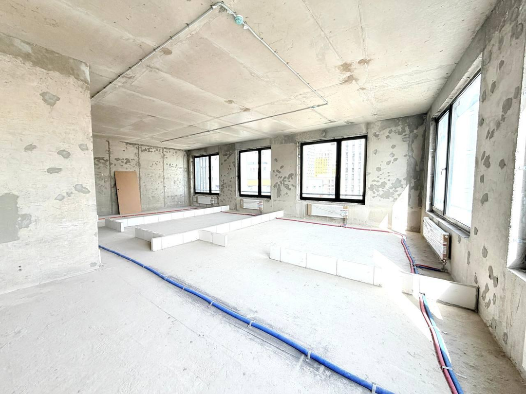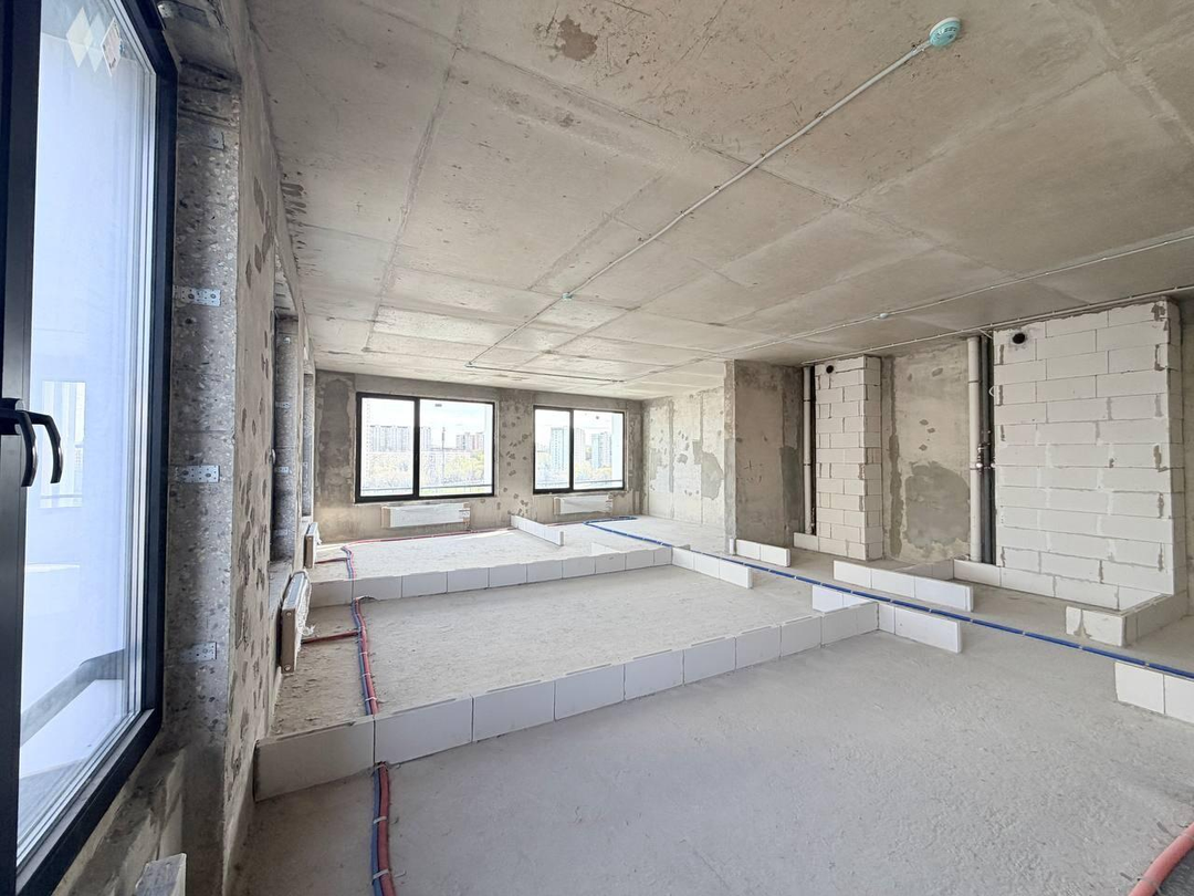 Без отделки, без межкомнатных стен, с высокими потолками.