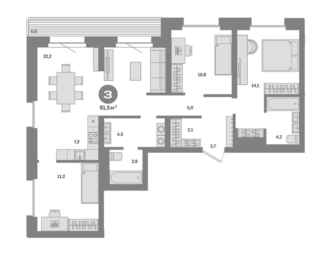 О квартире:91.5 м² общая площадь