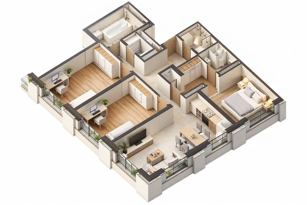 большая кухня-гостиная + 3 изолированные спальни — удобно для семьи, работы из дома и приёма гостей.