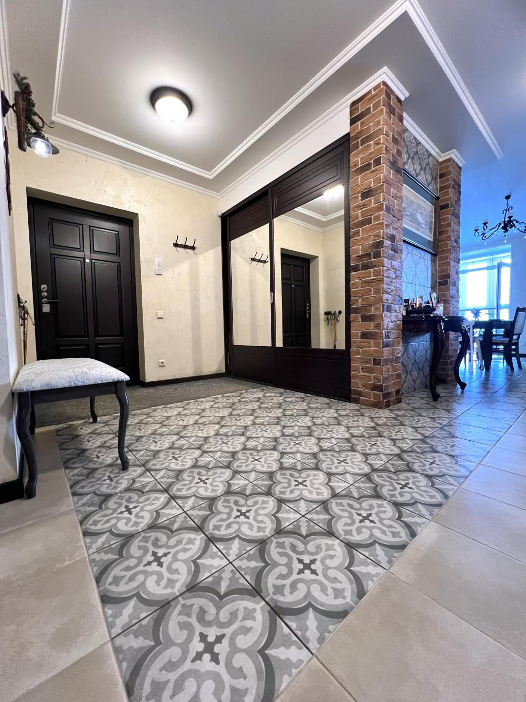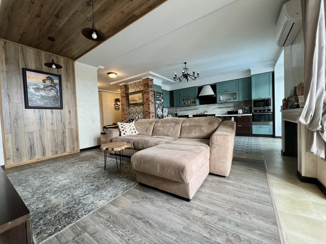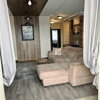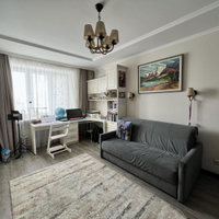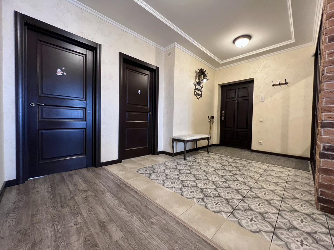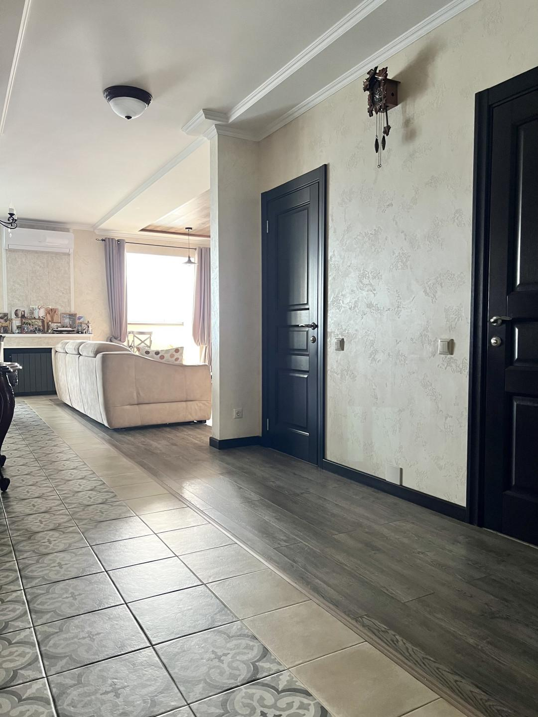 Переезд не планировался, поэтому к ремонту подошли ответственно. Произведен качественный дизайнерский ремонт. Потолки подвесные с основным и дополнительным освещением, стены в гостинной, прихожей и на балконах покрыты декоративной штукатуркой, на полу уложен керамогранит и ламинат 33 класса, качественная сантехника. Установлены кондиционеры.