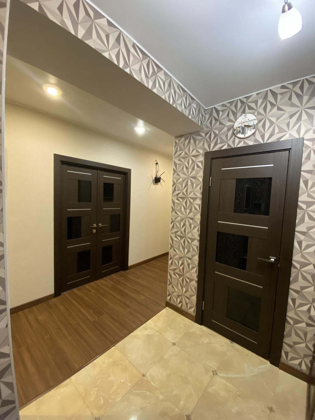 Хорошие межкомнатные двери , плитка в прихожей, кухне и санузлах .