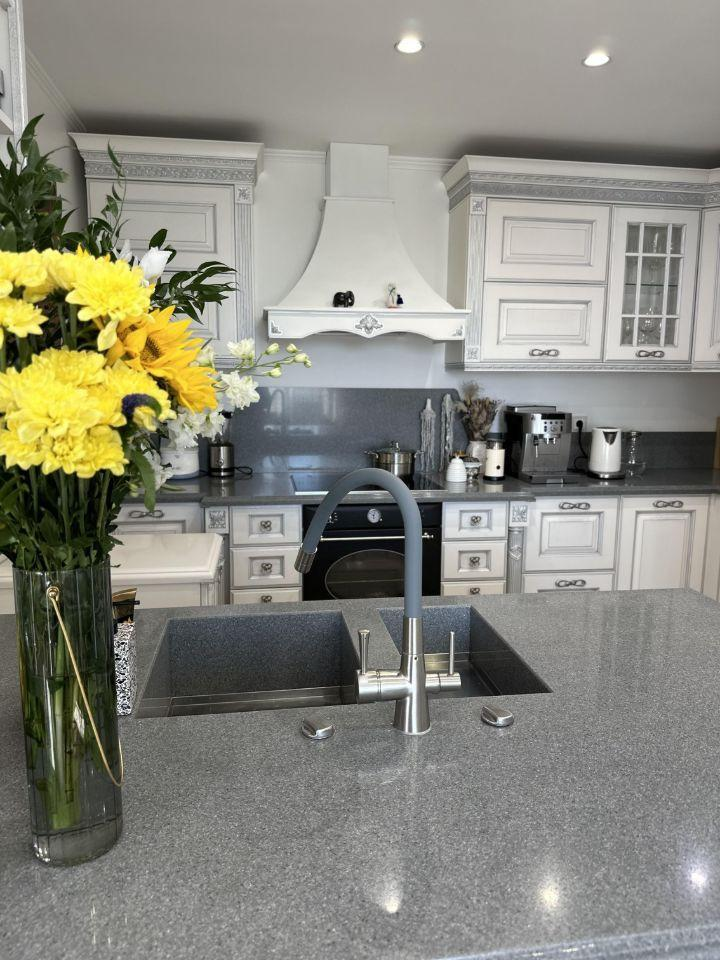 Кухонный гарнитур (итальянский массив Ясеня, столешница и фартук из кварца).