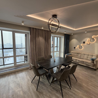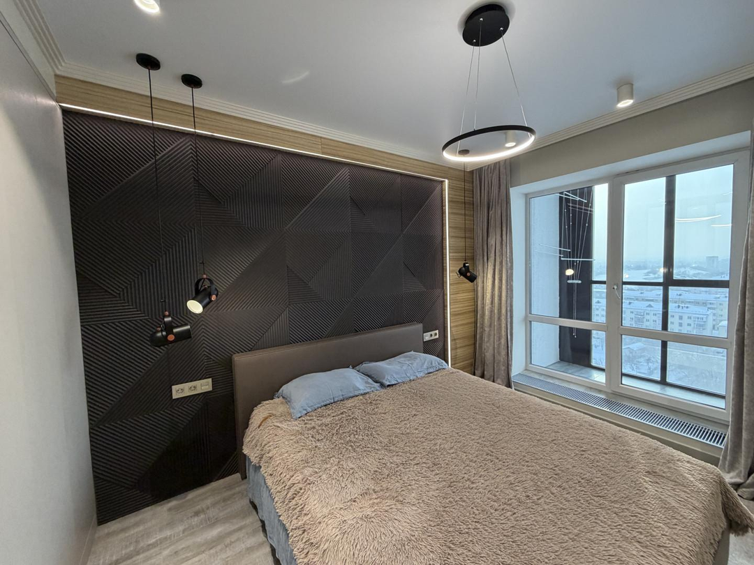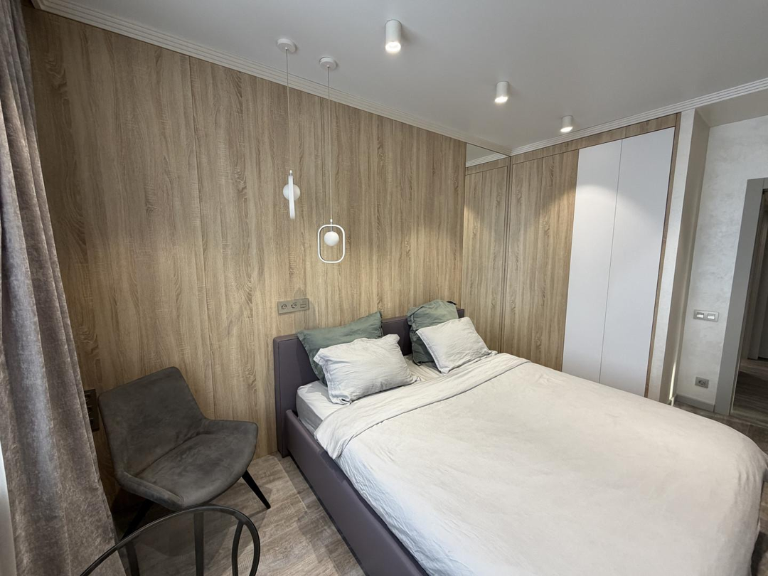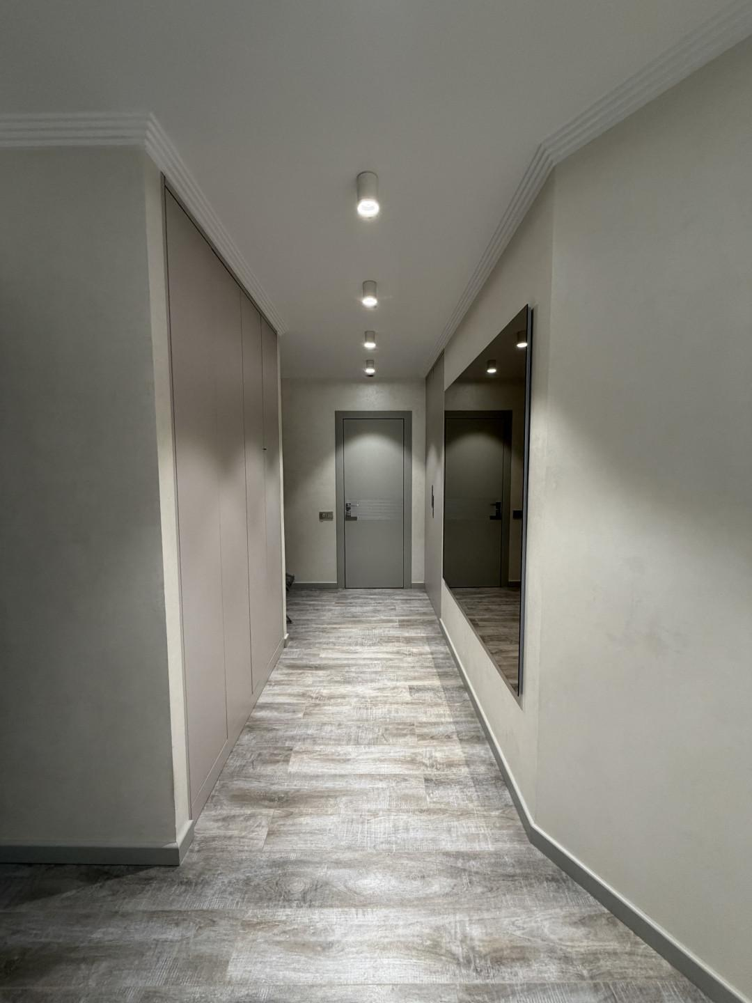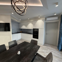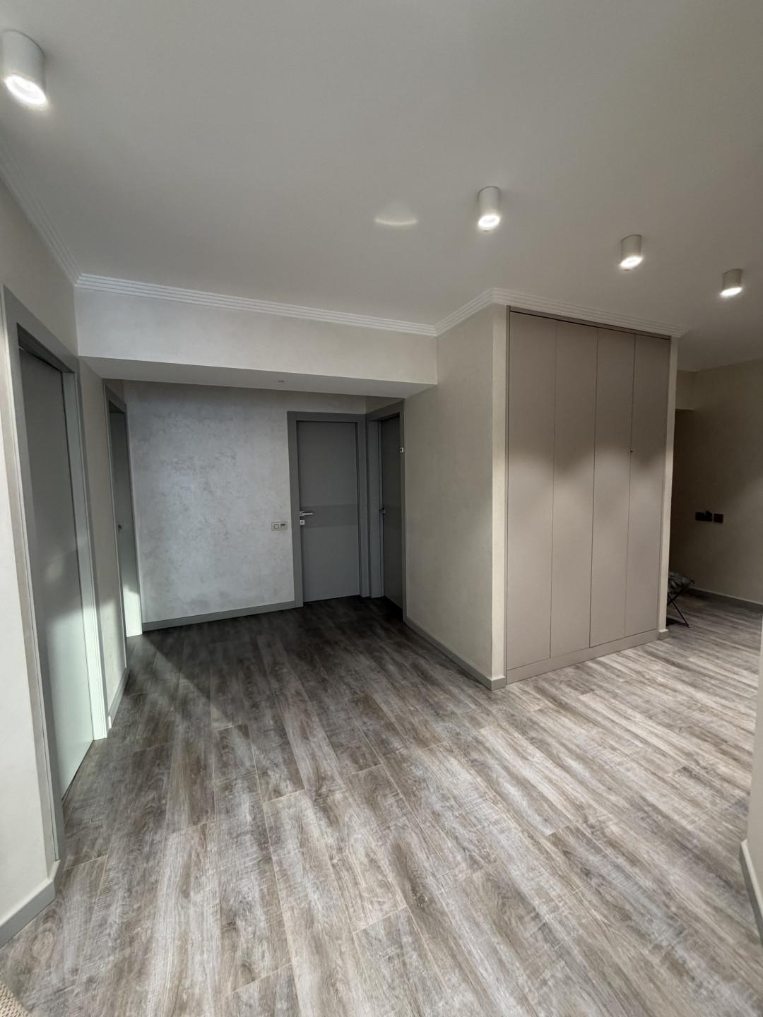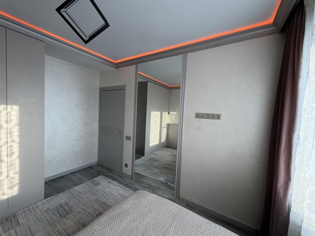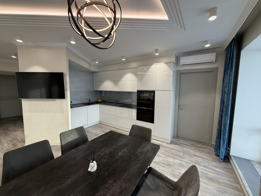 В квартире выполнен ремонт по дизайн-проекту из современных дорогих материалов, установлена мебель, в том числе встроенная (шкафы-купе в каждой комнате, кухонный гарнитур, организована гардеробная с системами хранения).