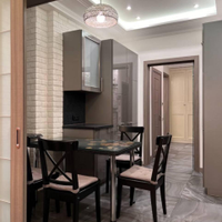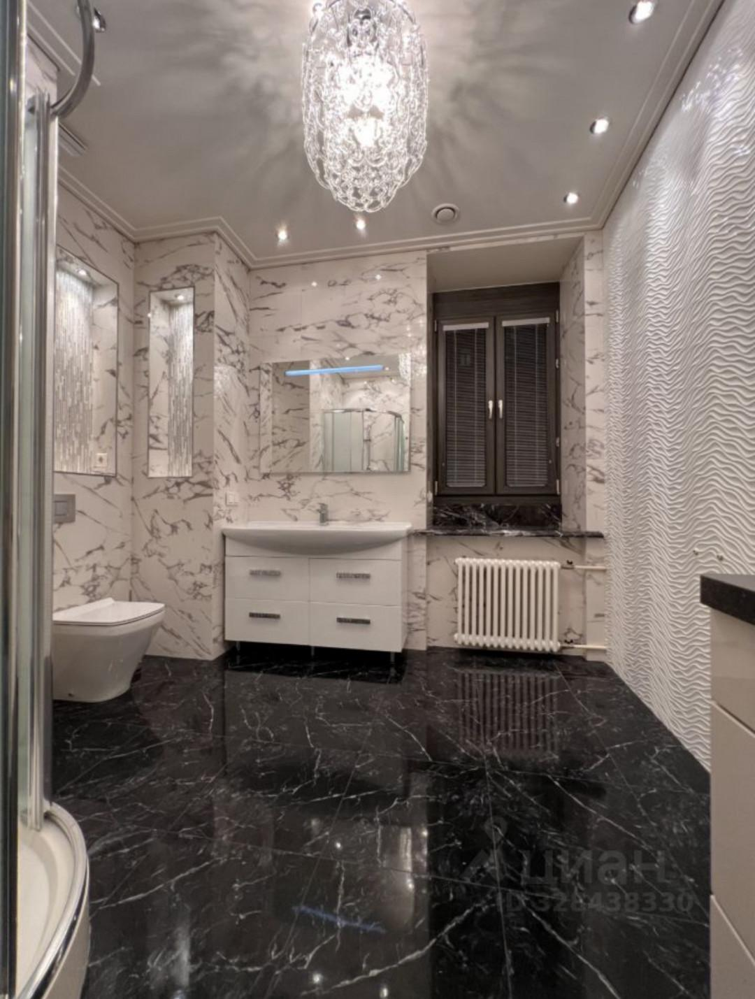 Отделка и оборудование самого высокого качества. Полы из керамогранитных плит коллекций Roberto Cavalli. Сложные многоуровневые потолки со встроенной и точечной светодиодной подсветкой, итальянские люстры и двери, радиаторы Arbonia, подоконники из черного итальянского мрамора, кухня немецкая "Bauformat", техника "Siemens" Bosh Liebherr (плита, духовка, холодильник, морозильник, п/м машина, свч, стирально-сушильная машина), немецкая сантехника.