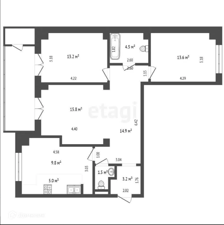 Площадь квартиры 108.3, Кухня-столовая- 20 кв.м, прекрасное место для всей семьи и друзейКомната 1 – 15,8 кв.м с выходом на большую лоджиюКомната 2 – 19,2 кв.м с большими панорамными окнами Комната 3 – 19,8 кв.м2 санузла- 5 и 6 кв.мГардероб- 5 кв.м -просторная, из которой можно сделать кабинет