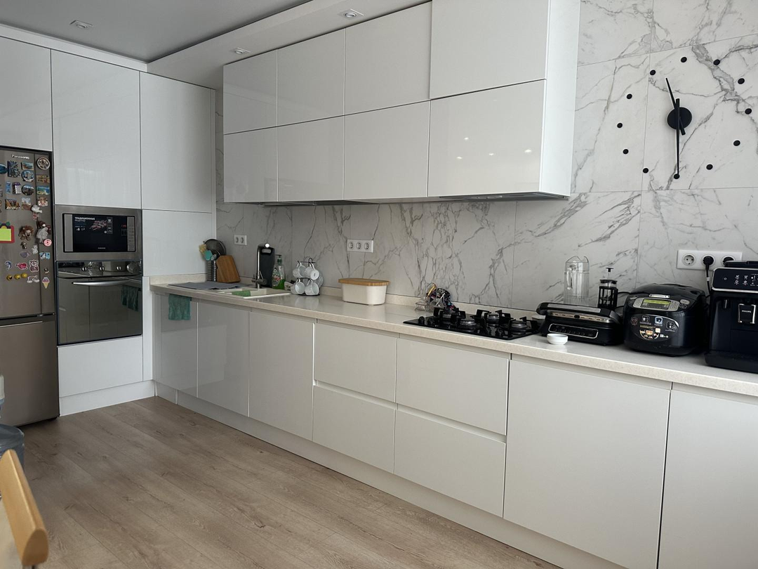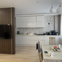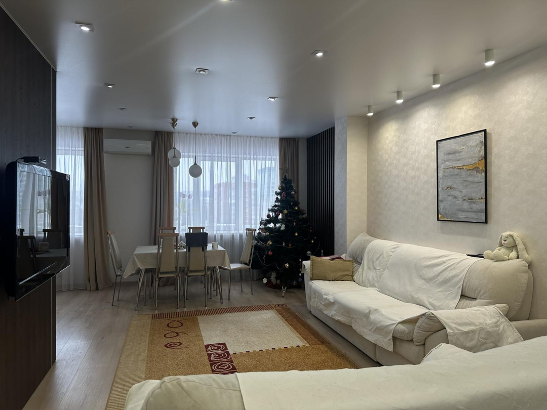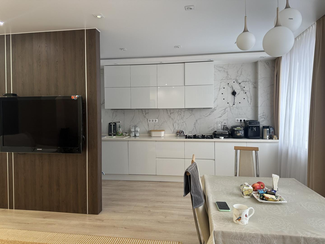 ️ Просторная кухня-гостиная оборудована современной мебелью и бытовой техникой высокого качества. Здесь прекрасно разместились два удобных дивана, уютная зона отдыха перед телевизором, обеденная зона и стильный кухонный гарнитур.