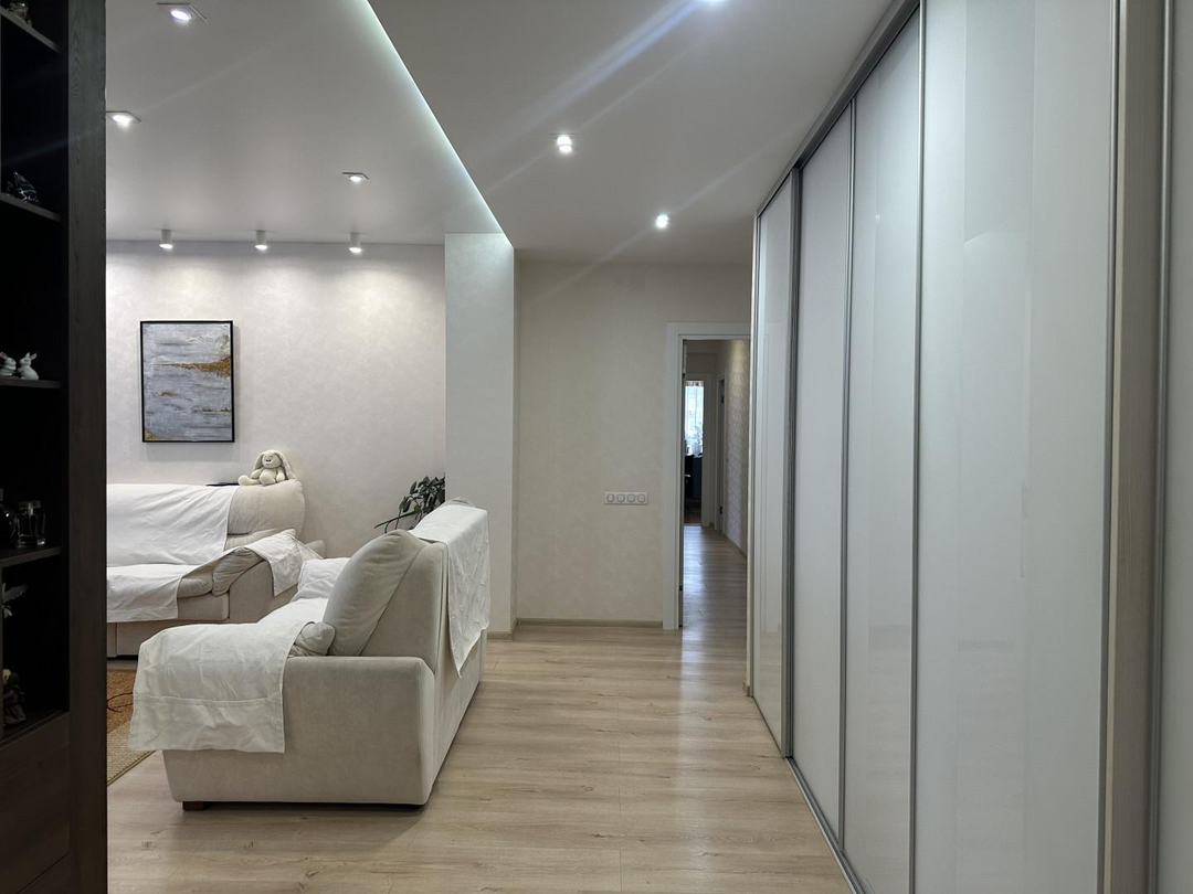 Общая площадь квартиры составляет 111,7 квадратных метров, что позволяет свободно разместить всё необходимое для комфортной семейной жизни.