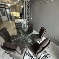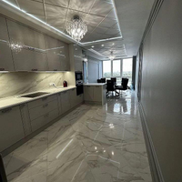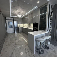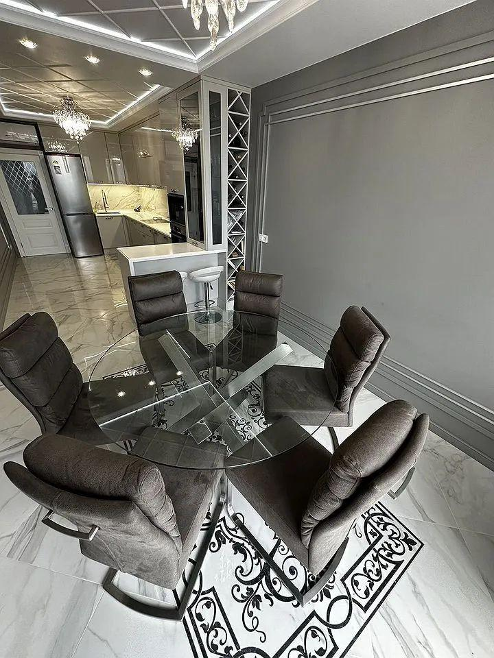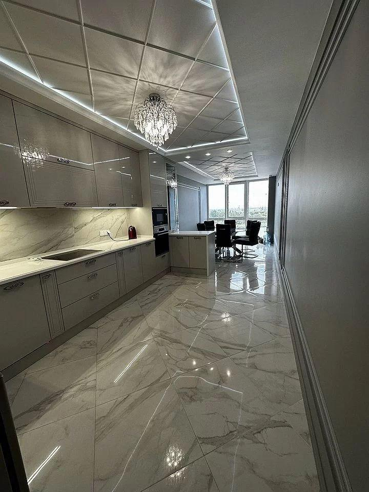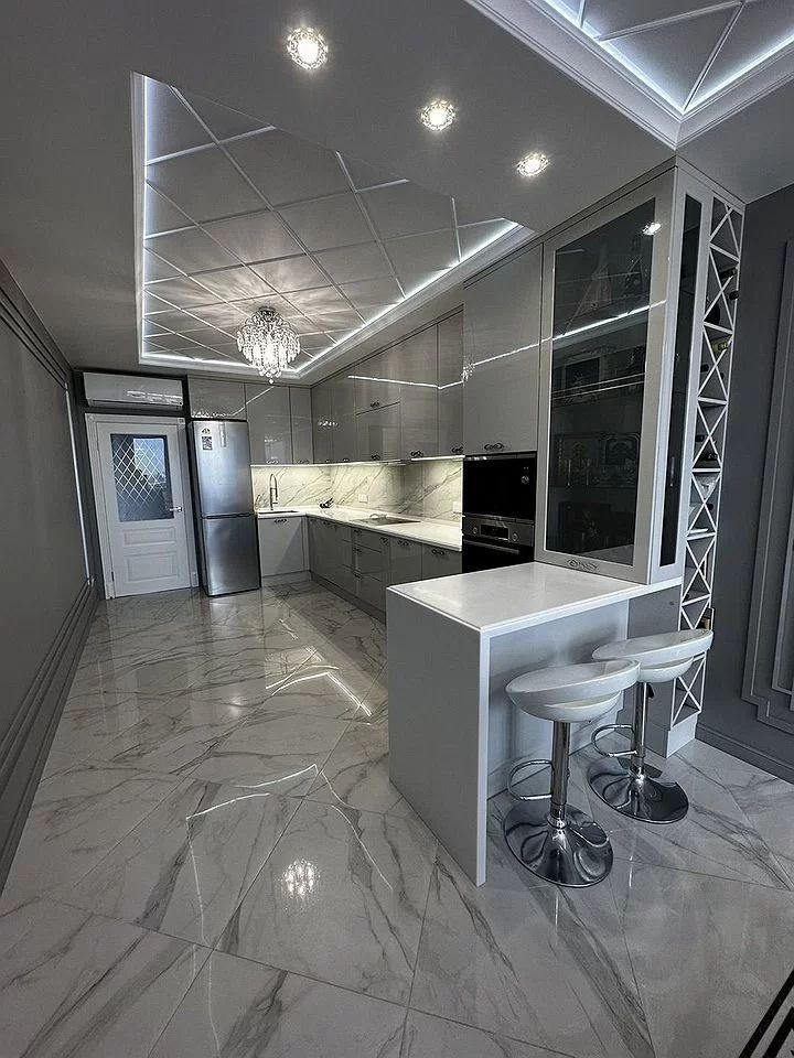 Кухня-столовая оснащена: кухонным гарнитуром выполненным на заказ с каменной столешницей, крашеными фасадами и встроенной техникой Воsh (Духовой шкаф, микроволновая печь, посудомоечная машина и варочная панель) и эксклюзивной обеденной группой. На полу крупногабаритный керамогранит и большое панно, потолок двухуровневый с зональными подсветками.