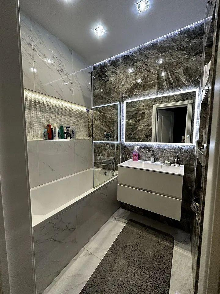 В санузлах установлена эксклюзивная серия сантехники Grоhе, отделка выполнена крупногабаритным керамогранитом (Испания).