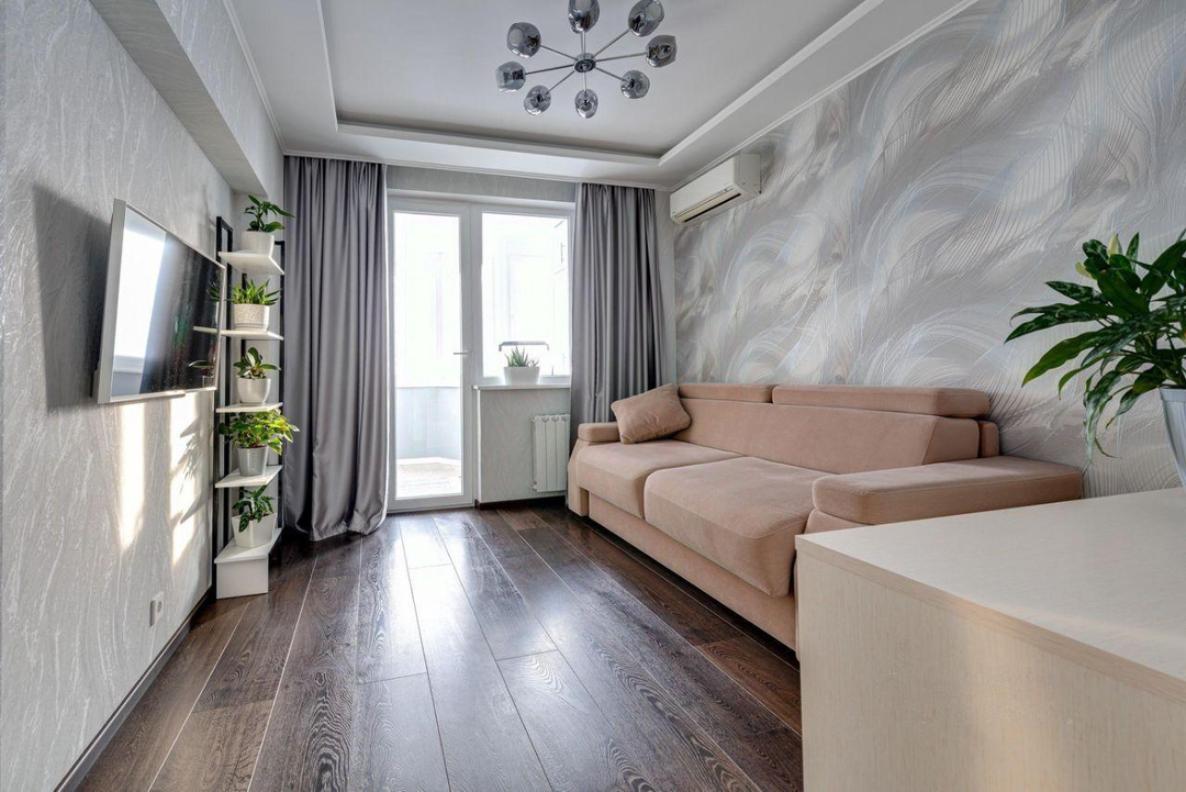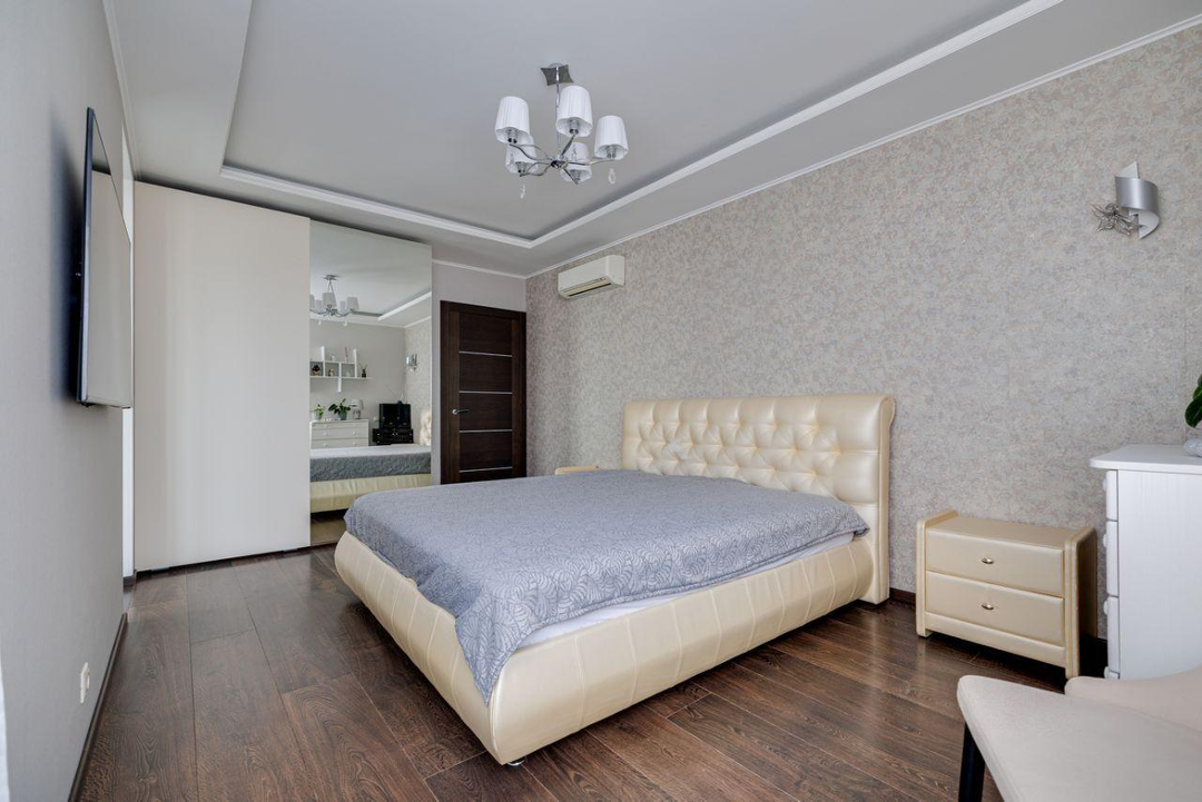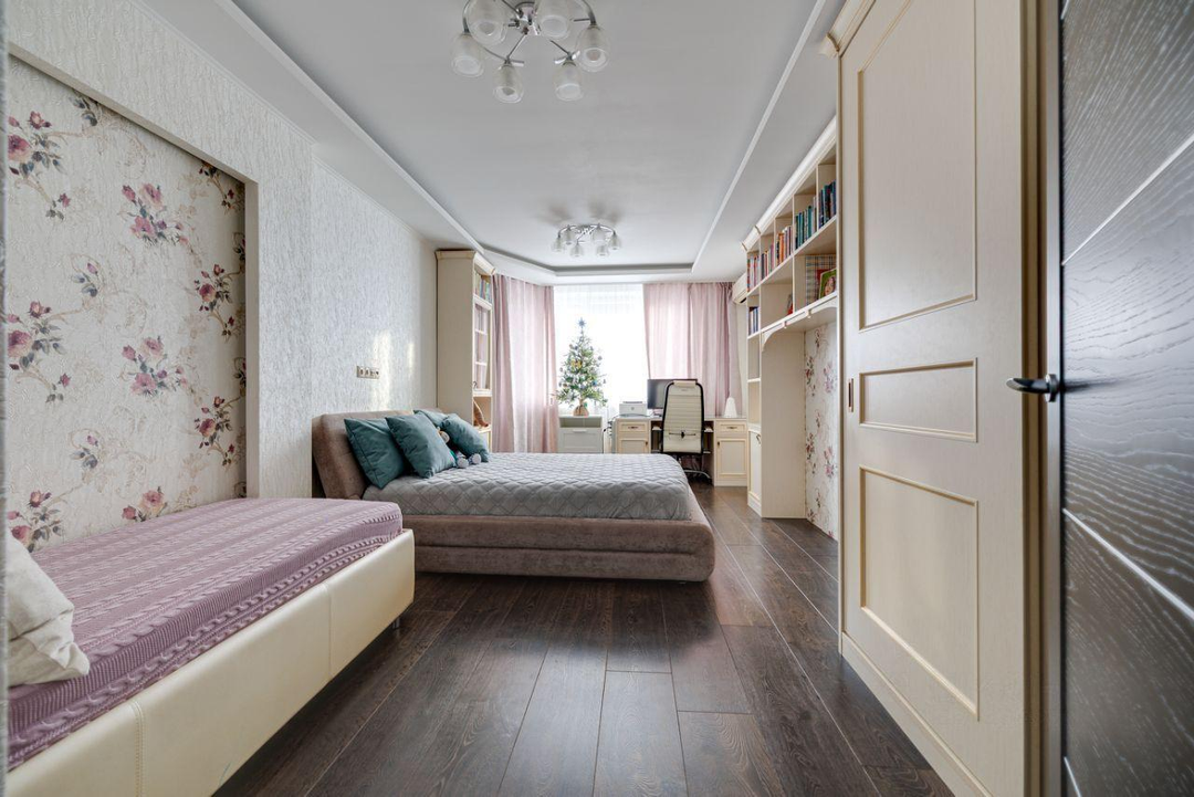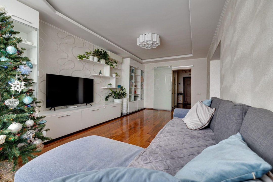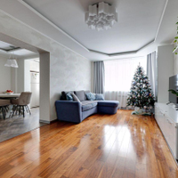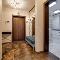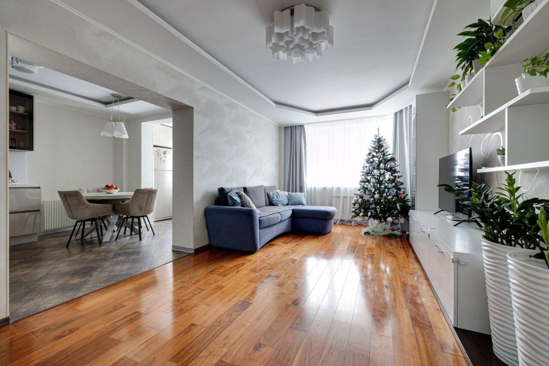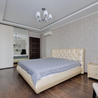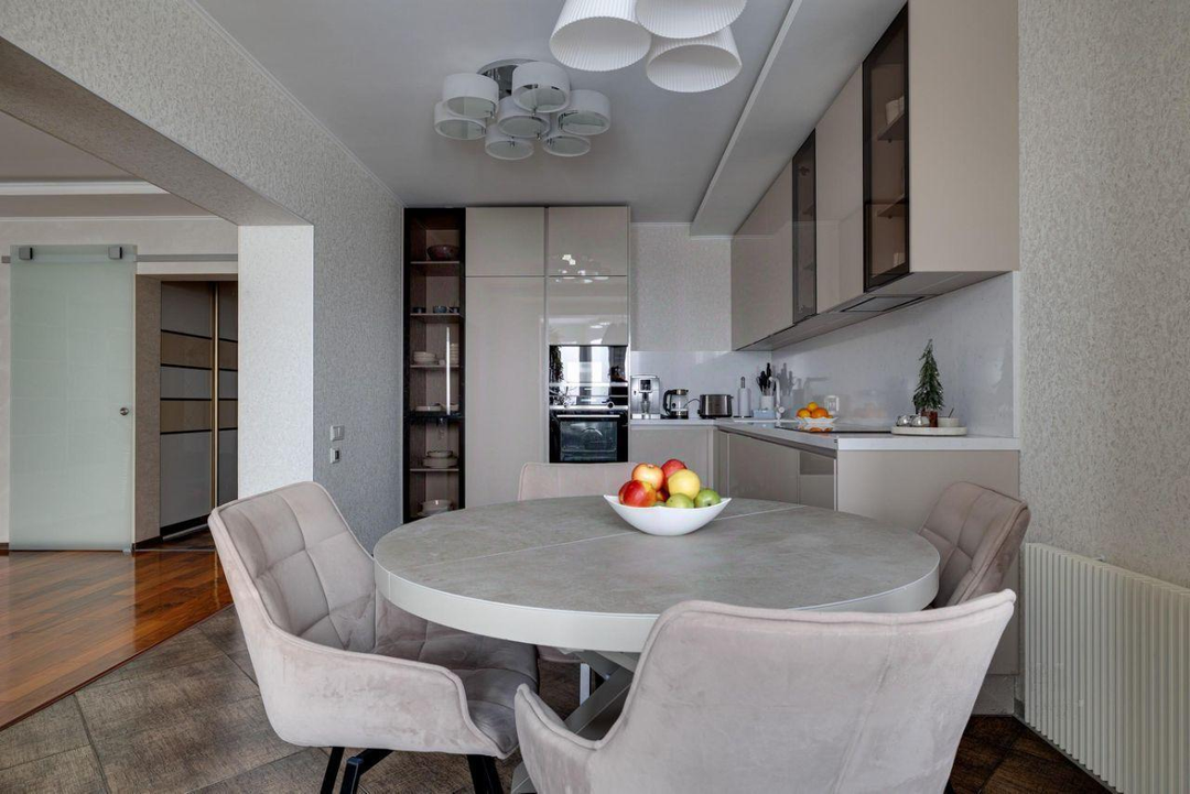 отдыха. В квартире есть всё необходимое: гостиная, кухня, три спальни и два санузла. Кухня плавно