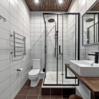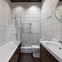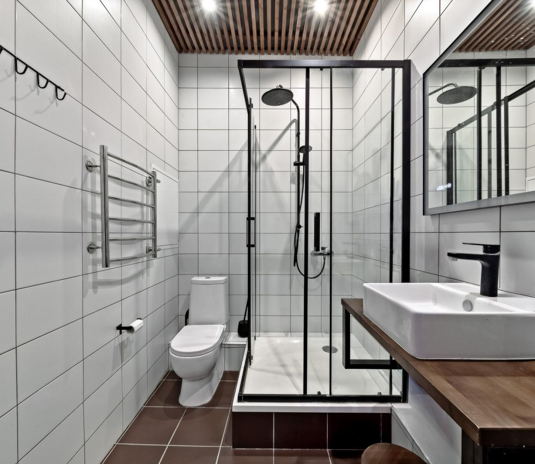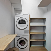 Совмещенный санузел с душевой кабиной, отдельное помещение для стиральной и сушильной машины.