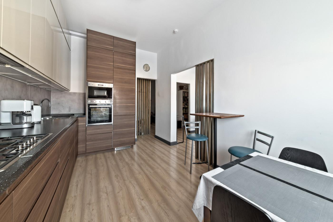 Просторная кухня оснащена всей необходимой техникой (газовая плита, вытяжка, посудомоечная машина, система фильтрации воды, холодильник, духовой шкаф и микроволновая печь). Это идеальное место для семейных ужинов и приёма гостей.
