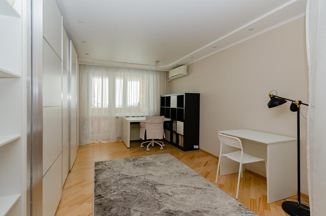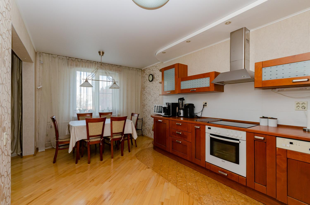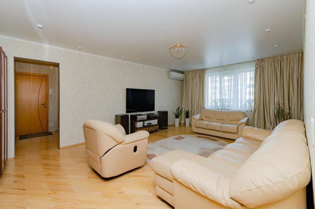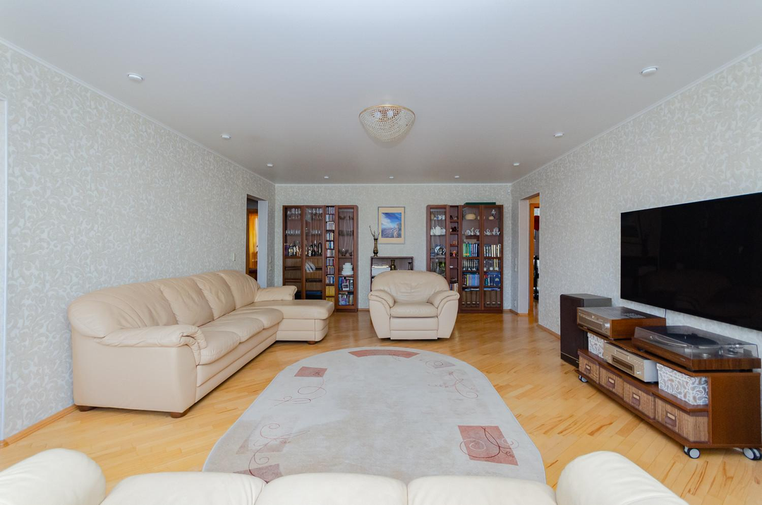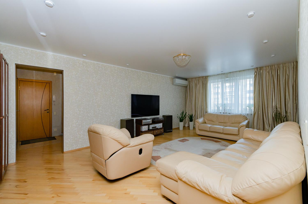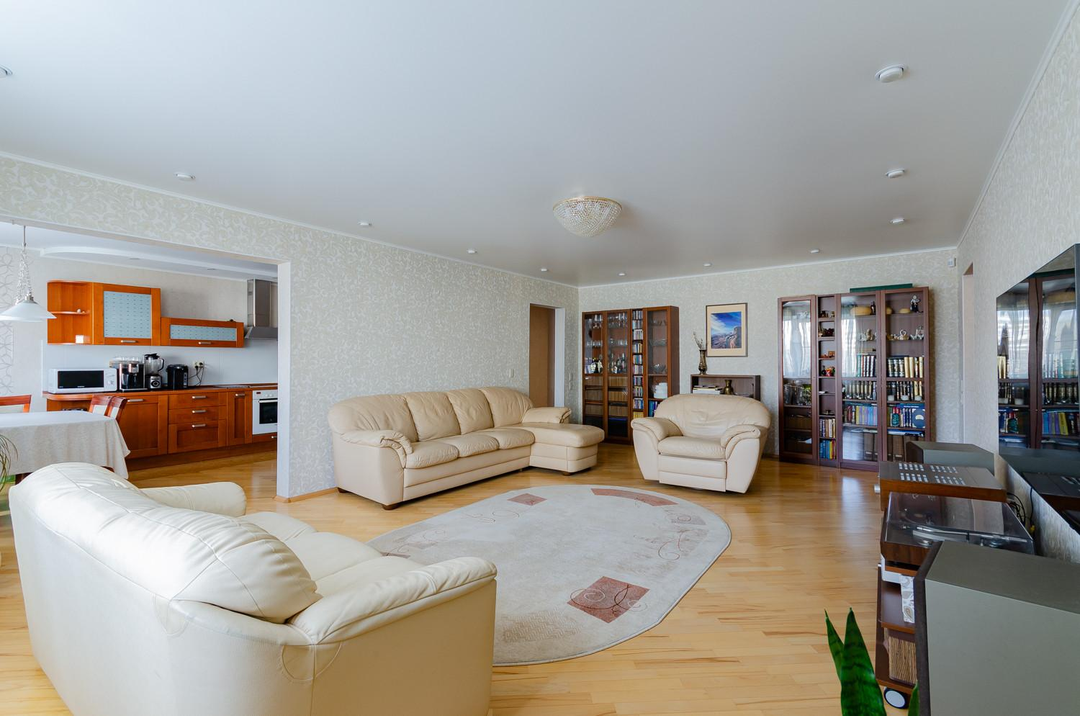 Просторная светлая теплая квартира с большим залом и кухней, площадью 118,7 м², расположенная на 2 этаже 10 - этажного дома с узаконенной перепланировкой.