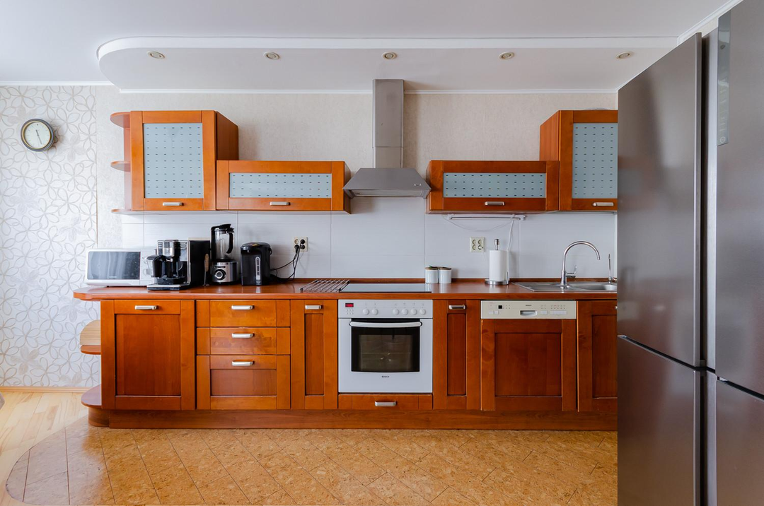 Особенности квартиры:По всей квартире выполнен штучный паркет бук — экологично и стильноНатуральная пробка на полу в кухне и интерьер из Италии: фасады кухни из натурального дереваРимские шторы, сшитые на заказСовременная техника Bosch, включая посудомоечную машинуСигнализация и городской телефонный номерПросторный зал ориентирован на север, спальни — на югВ квартире остаются все шкафы, люстры, шторы, столы и стульяВанные комнаты со свежим ремонтом, теплые полы, смесители Grohe и испанская сантехникаДва санузла : один санузел просторный с окном, второй - совмещенный Полностью заменена электропроводкаБалкон и теплая лоджия
