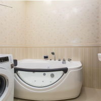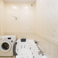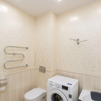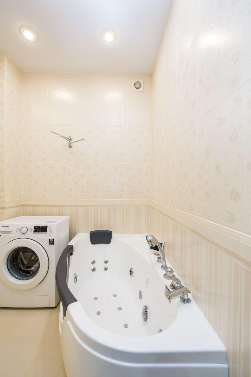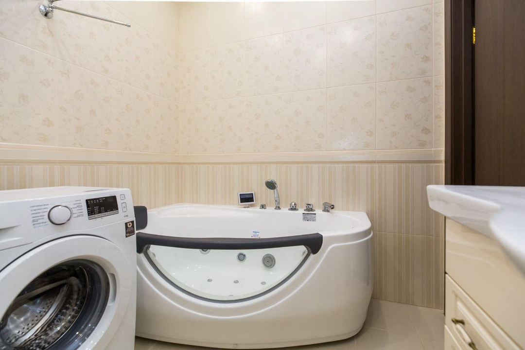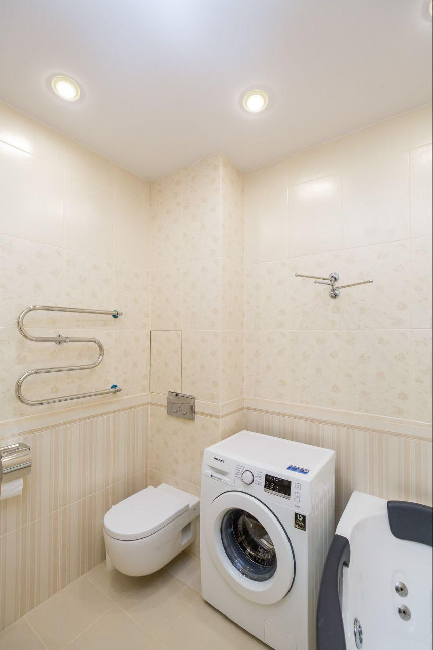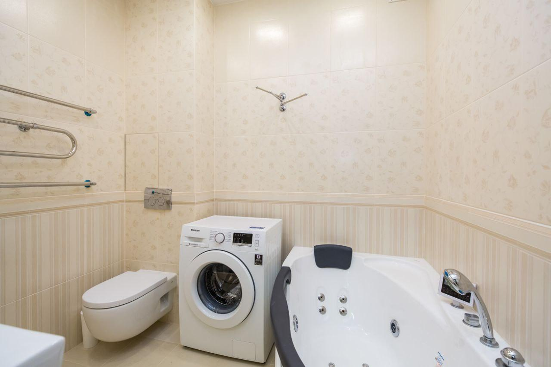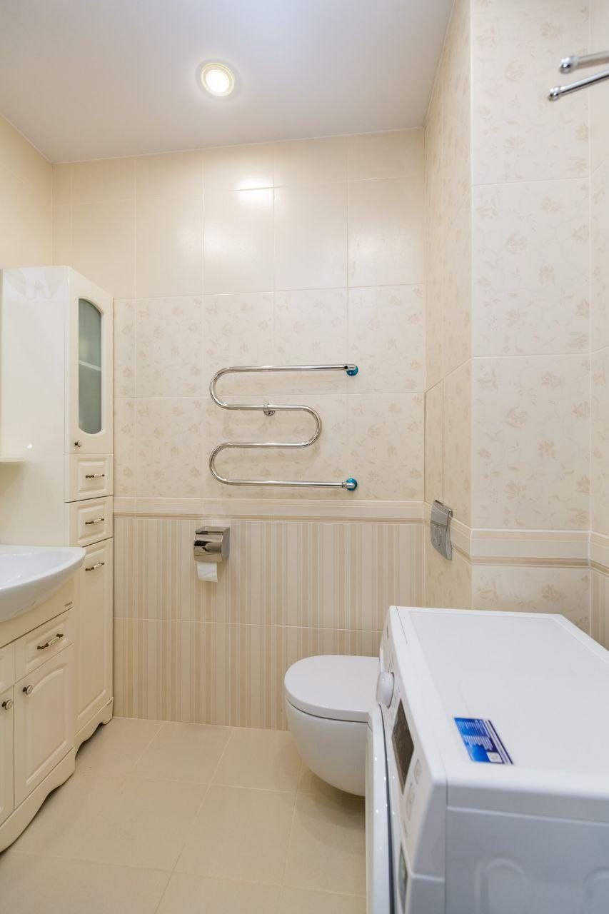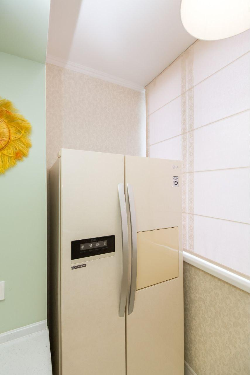 Вся необходимая встроенная техника: двухстворчатый холодильник, посудомоечная и стиральная машины, варочная панель, духовой шкаф.