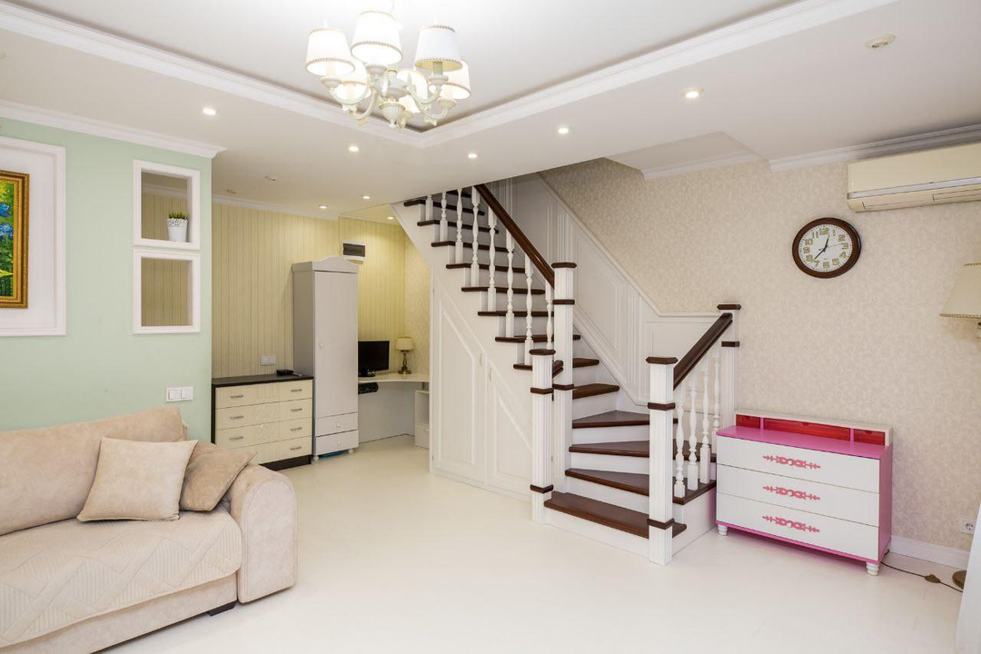 Первый этаж: светлая гостиная, кухня, санузел с душевой кабиной и биде, гардеробная, мини-кабинет.