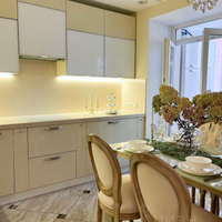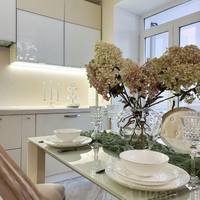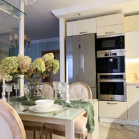 - Современная кухня 9 кв.м с обеденной зоной, мебельным гарнитуром и техникой — удобное место для приготовления и приёма пищи.