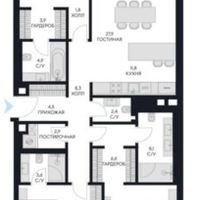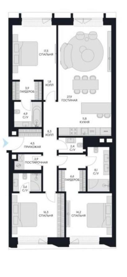 Планировка:-просторная кухня-гостиная , 3 изолированные спальни, к каждой свой санузел и гардеробная, гостевой санузел, постирочная.