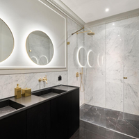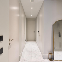 Инженерный паркет из массива дуба, плитка из натурального мрамора (Италия), скрытые двери.