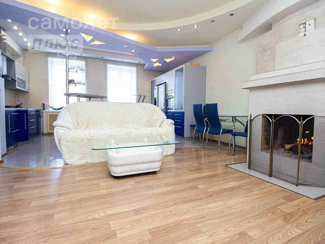 Двухуровневая квартира в центре города с камином в гостиной.