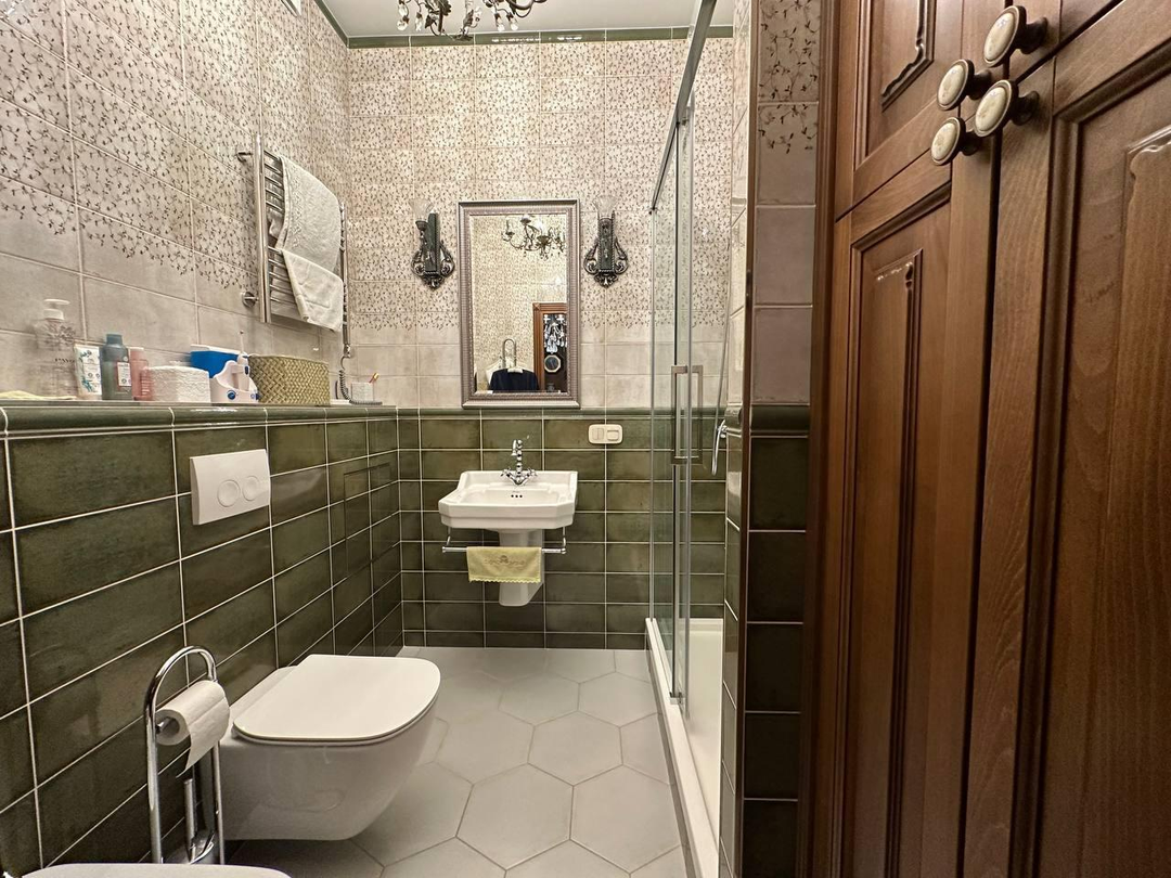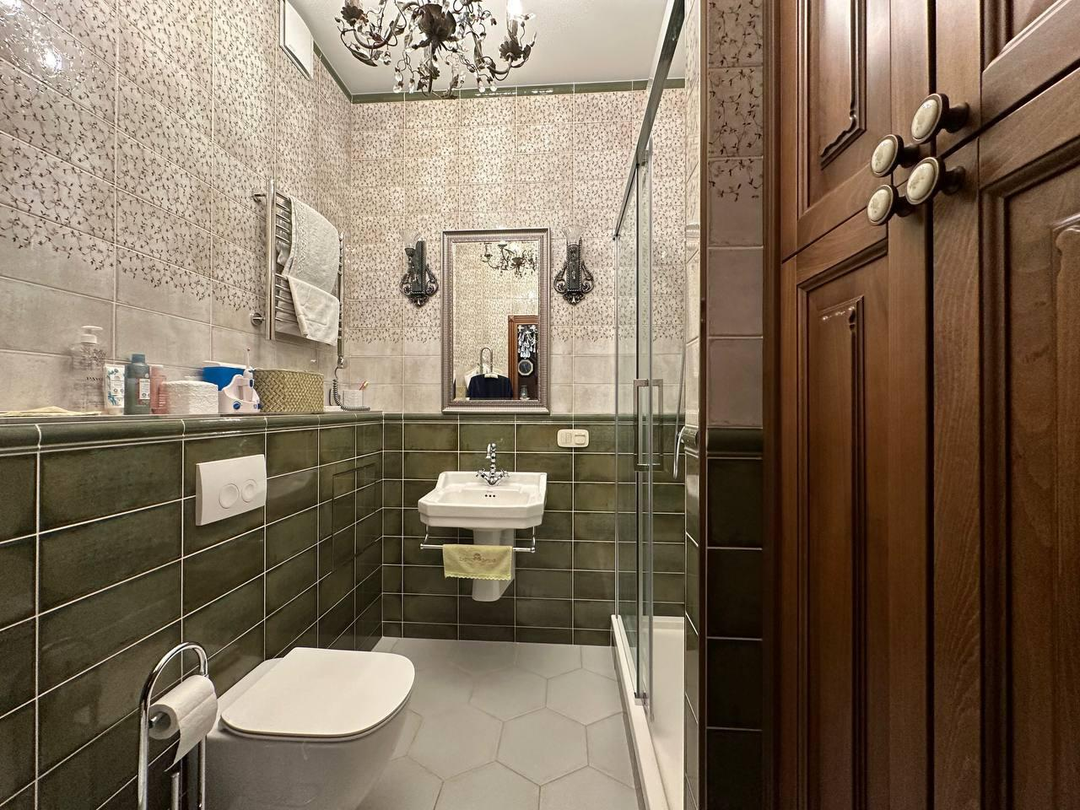 - в ванной керамогранит/джакузи/душевая кабина/современная стиральная машина,