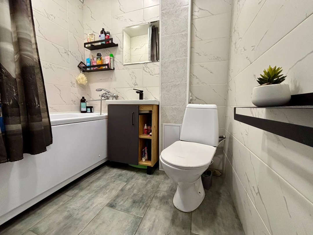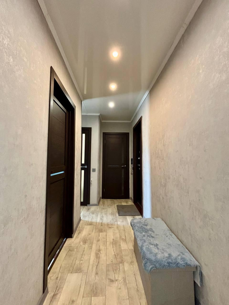 Потолки натяжные. Окна пластиковые в хорошем состоянии, на полу прочный и качественный линолеум. Стены выровнены, оклеены современными обоями. Санузел совмещённый. Проведена замена систем водоснабжения и электроснабжения.